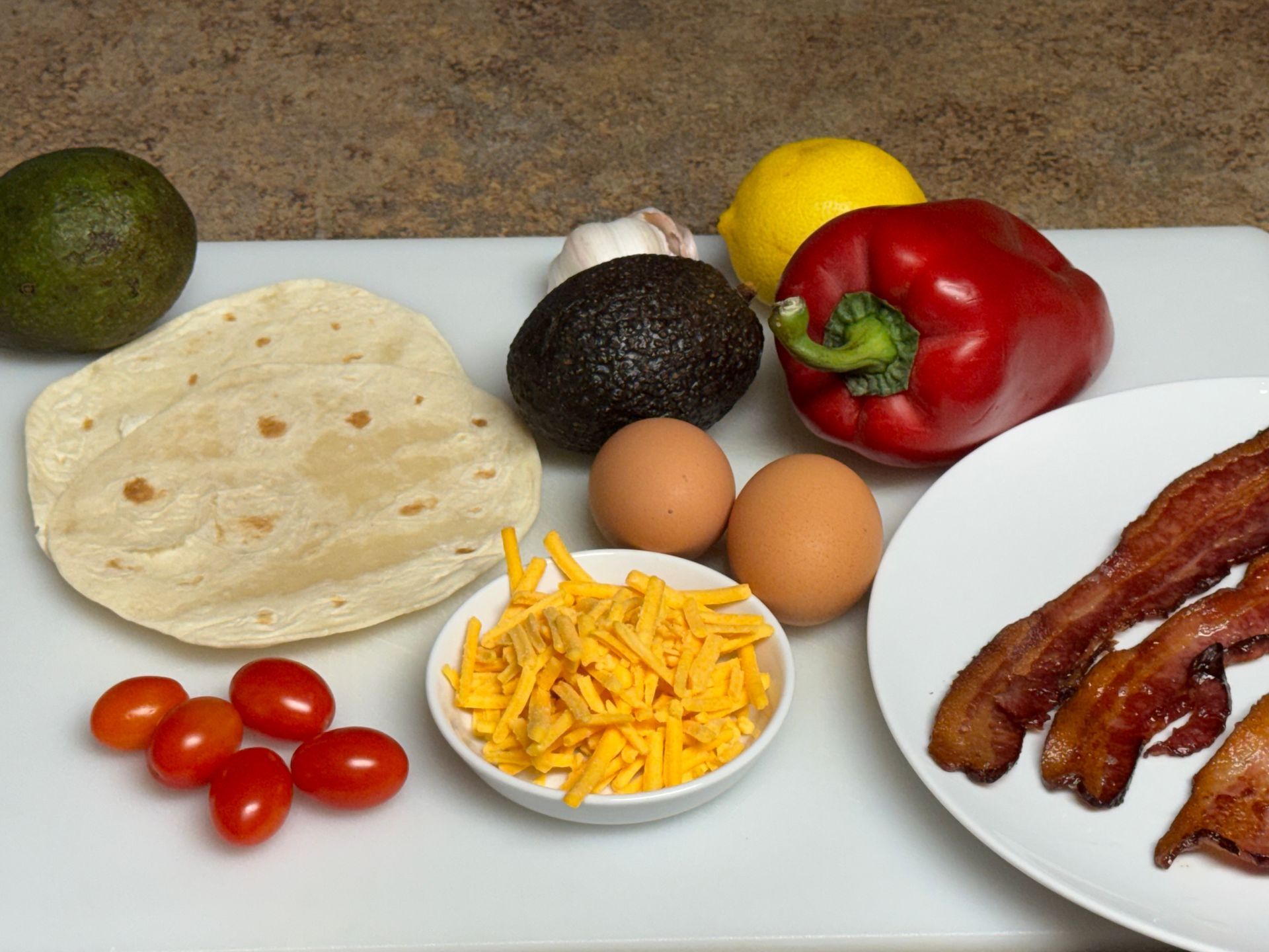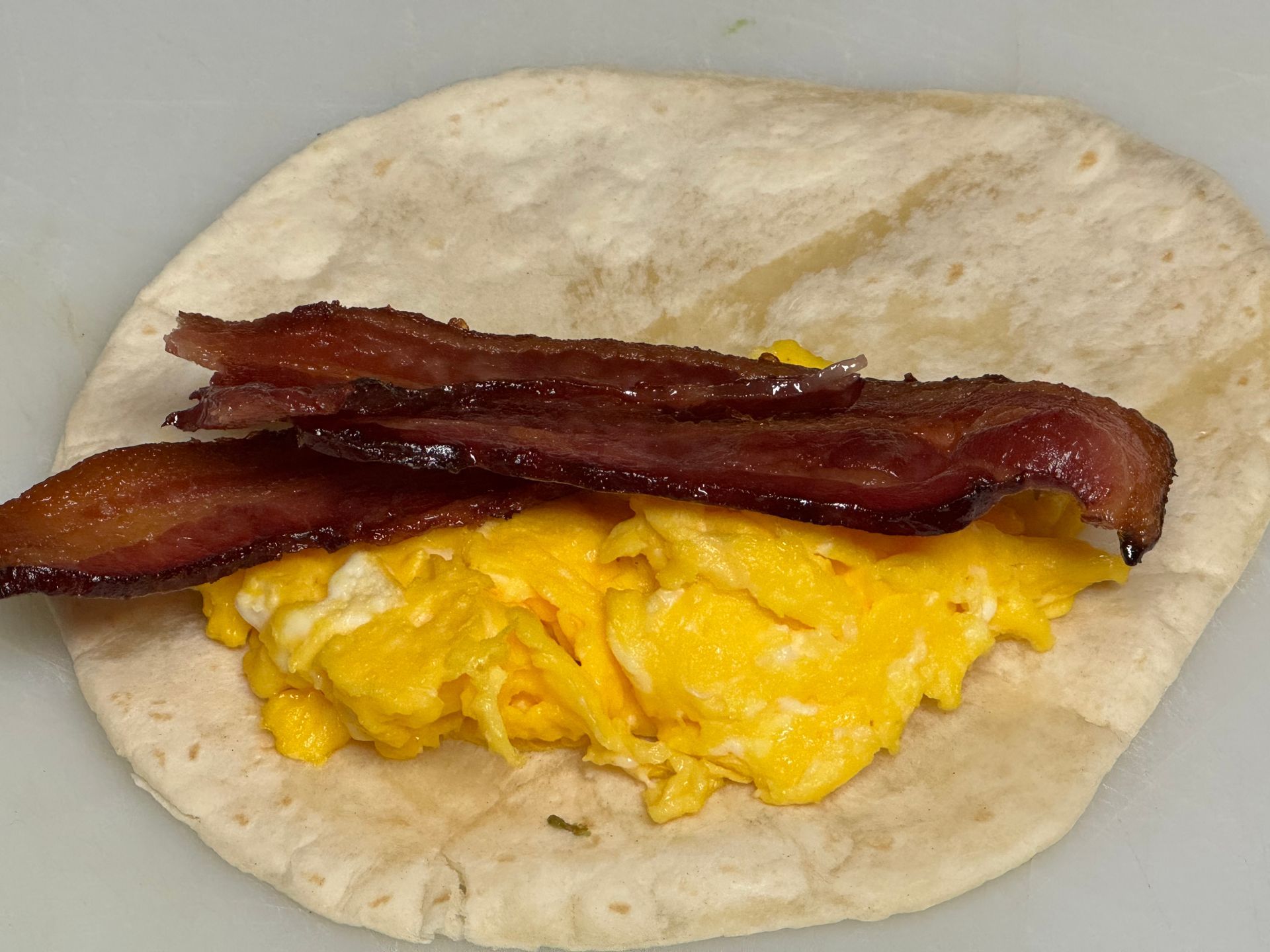 Spoon scrambled eggs, shredded cheese onto tortilla and add bacon stips in the center being careful to leave room to roll the tortilla.