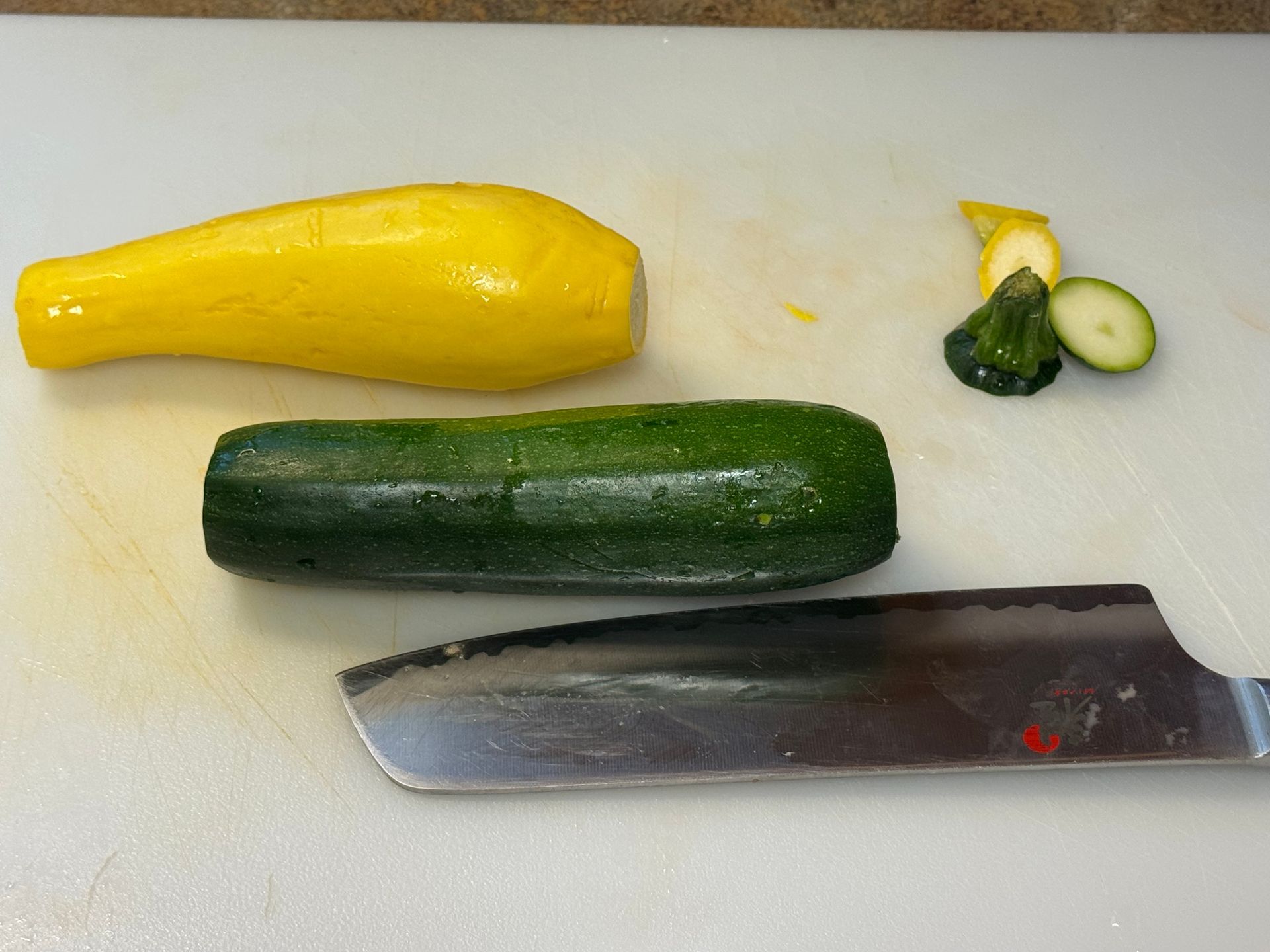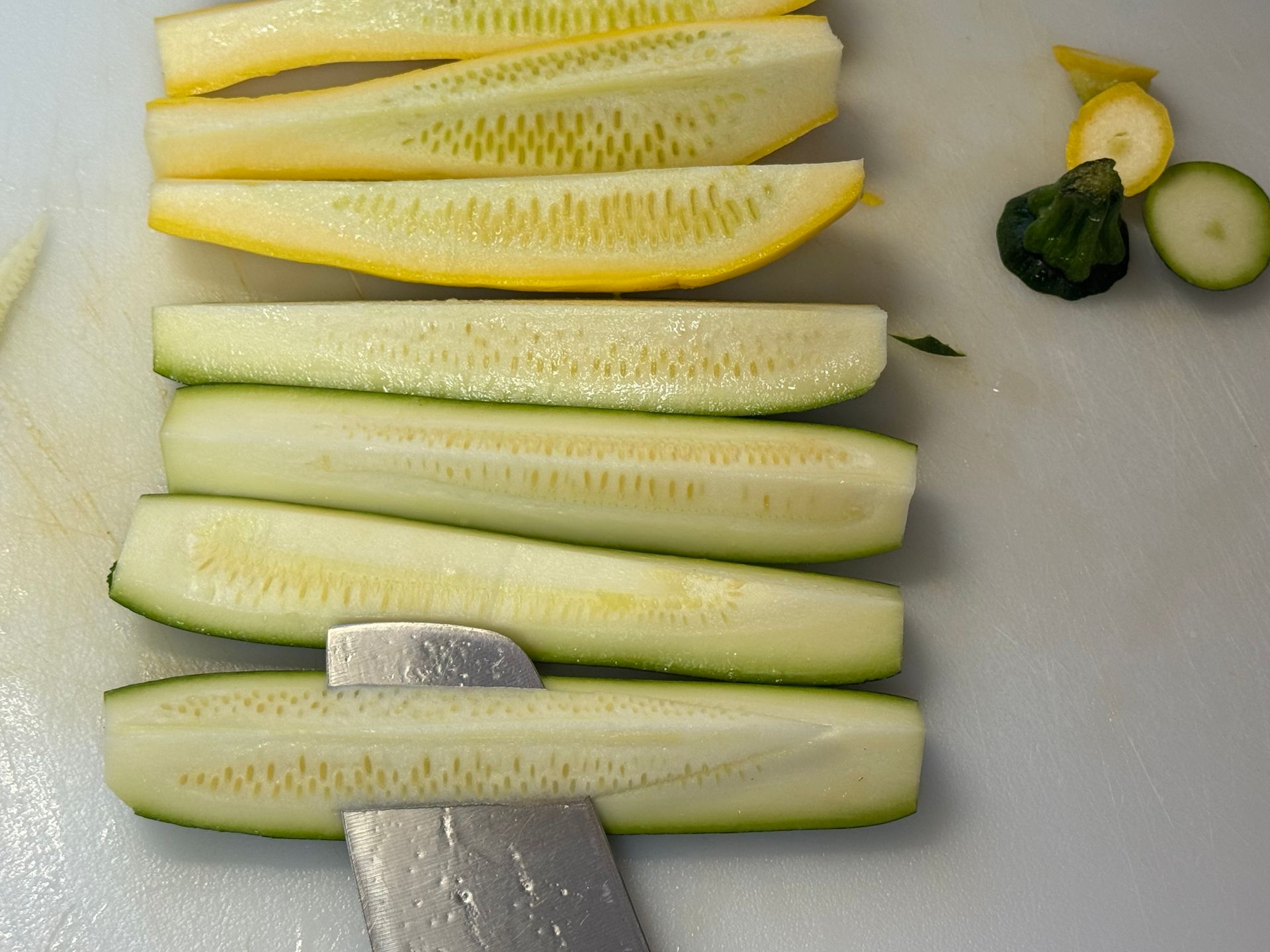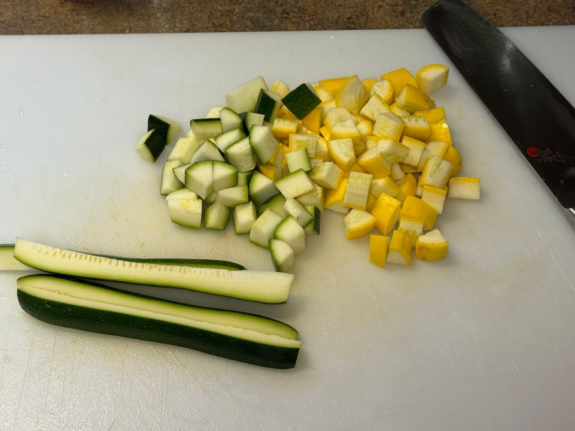I prefer a diagonal or oblique type of cut for better utilization of the squashes. But nicely diced squashes are great for ratatouille or simply sauteed with tomatoes and basil.
