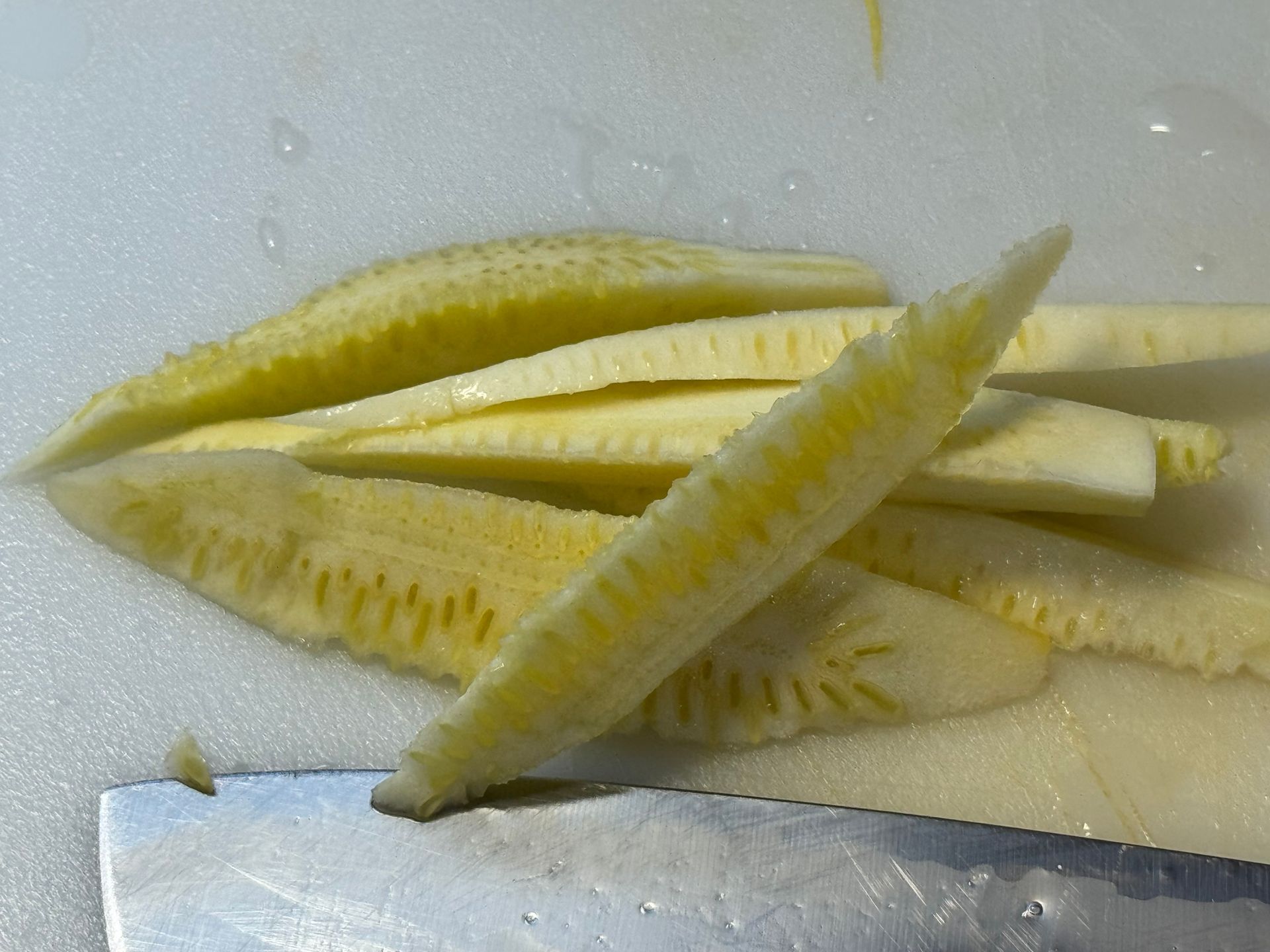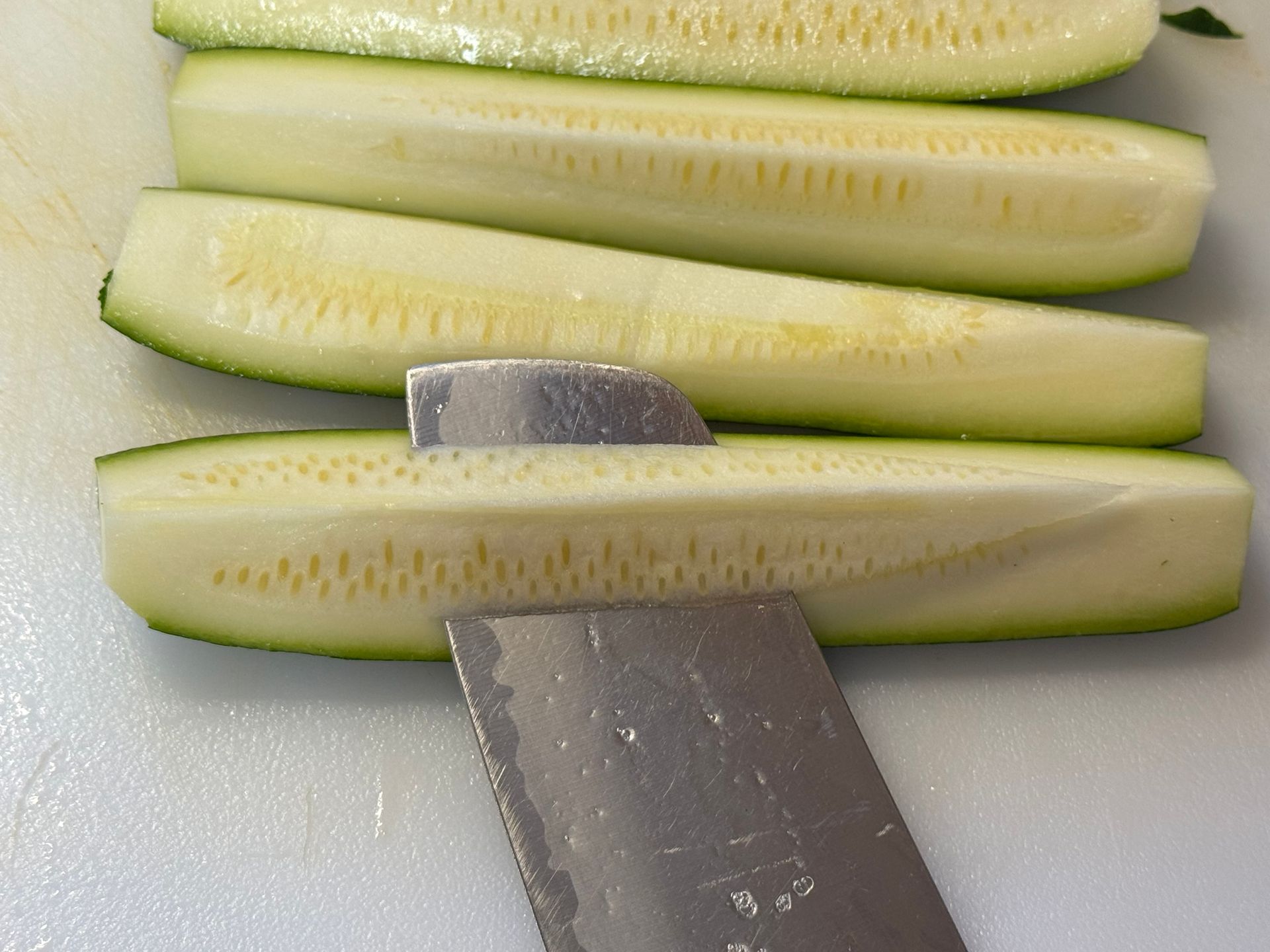 With a sharp knife, slice the center seed area out of each squash, slicing parallel and reserving the 'meaty' part of the squash (with the skin on).