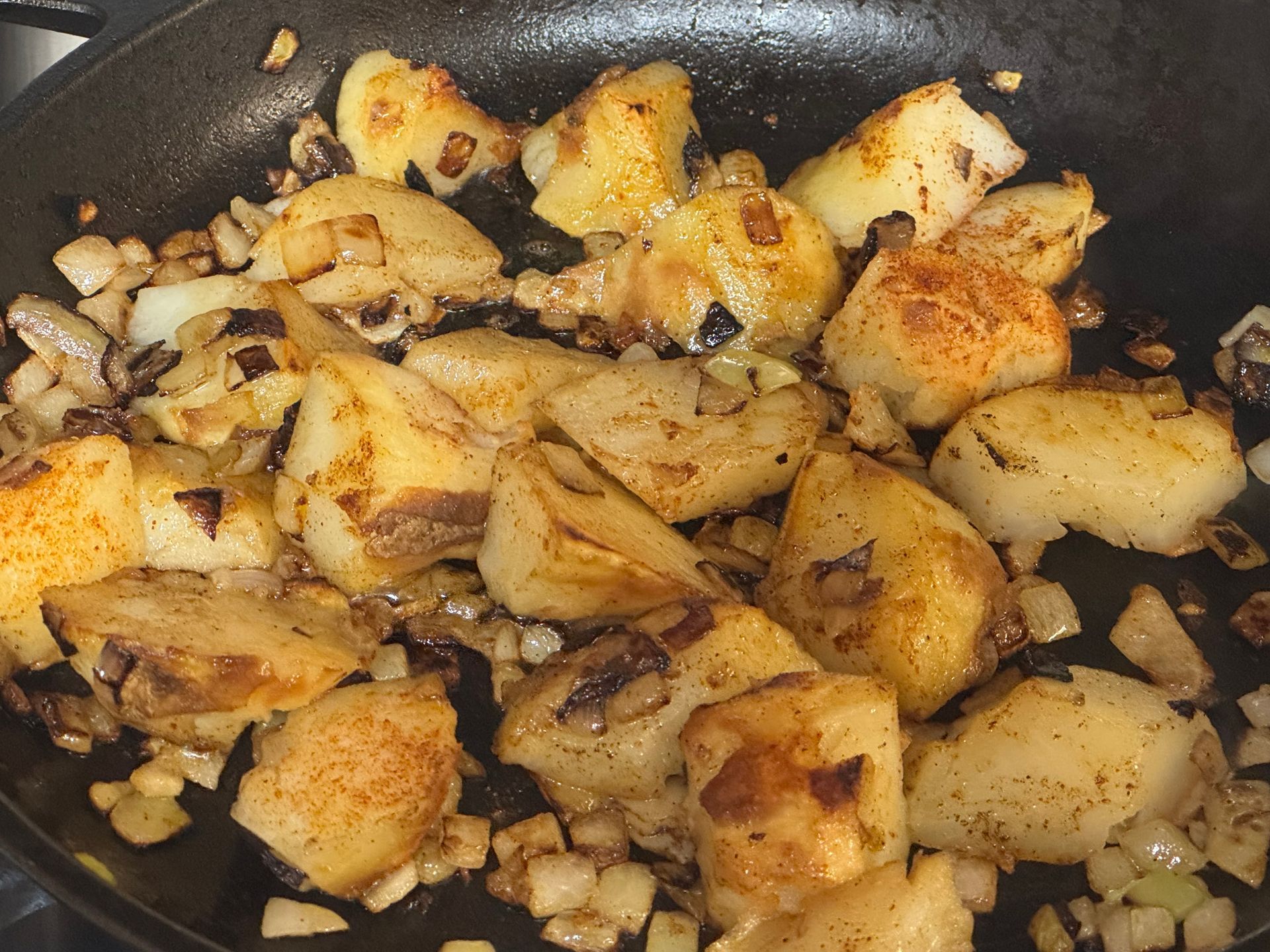 Add the potatoes, season with salt and pepper. I like to add a little paprika for spice and color. Add a little more fat if it looks dry.