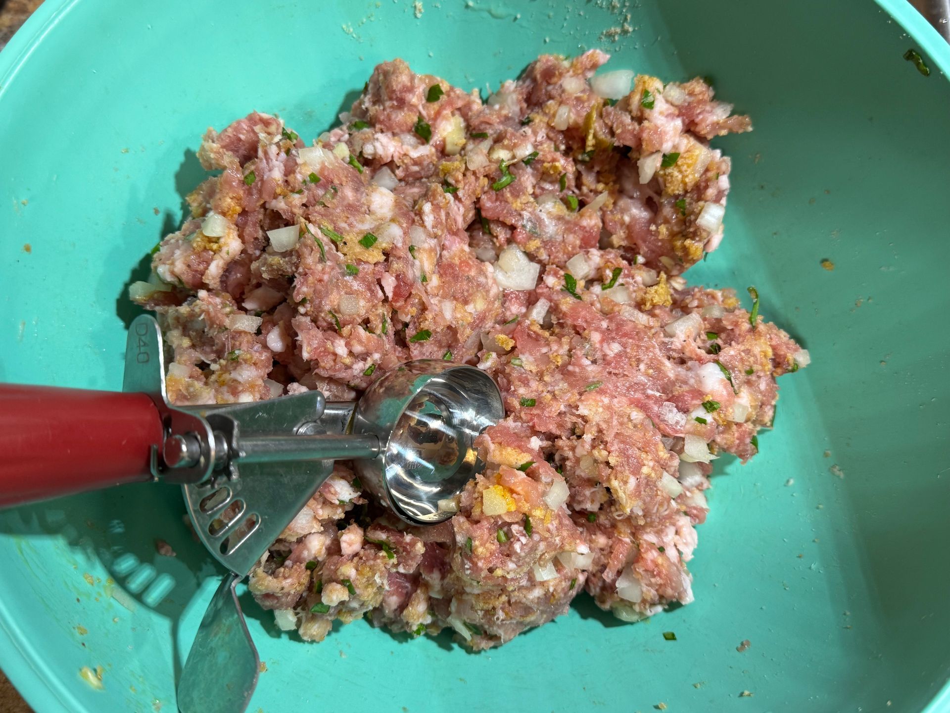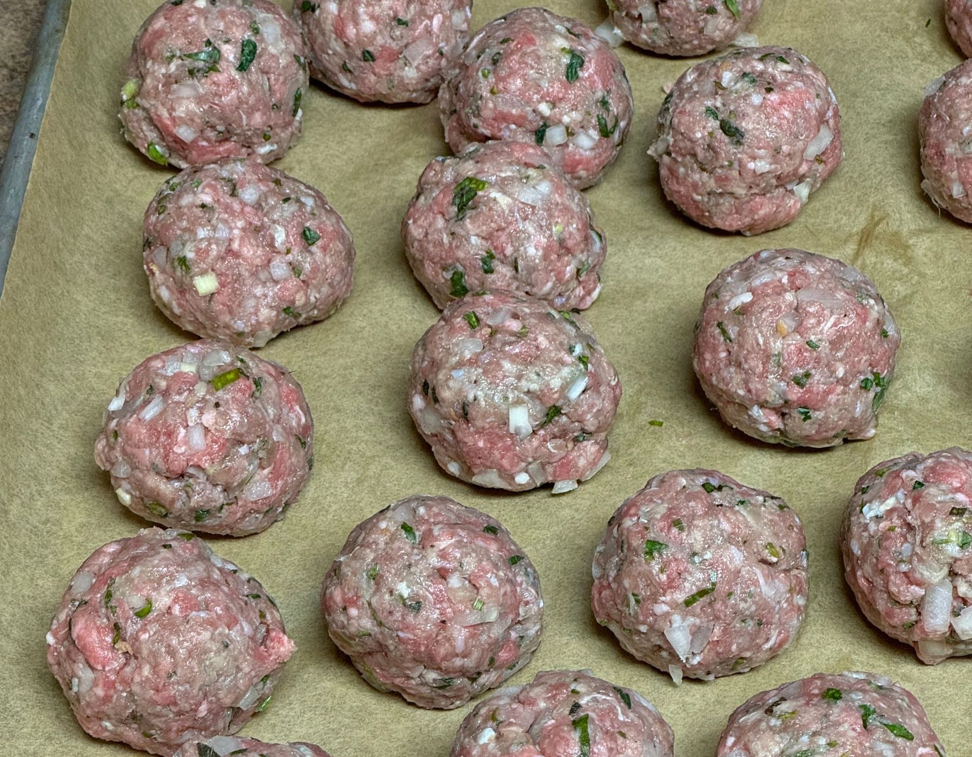 Add all of the ingredients into the mixing bowl, mix until incorporated. Take one spoonful & fry it in oil to taste. Add more seasoning if desired. Form small balls with meat mixture & place onto a sheet pan lined with parchment.