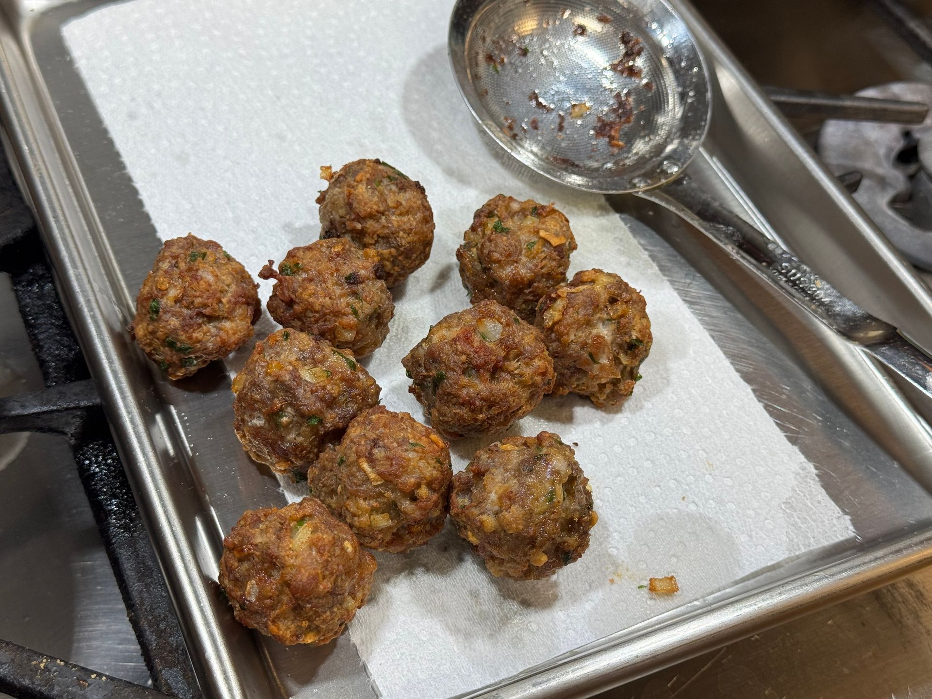 Fry the meatballs in batches, taking the browned meatballs out with a slotted spoon and placing onto a plate with paper towel to absorb extra oil.