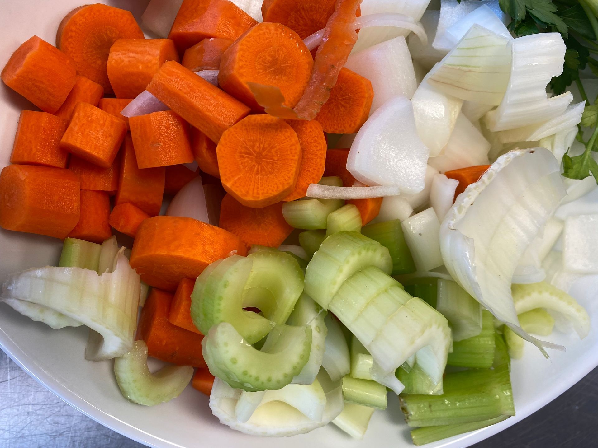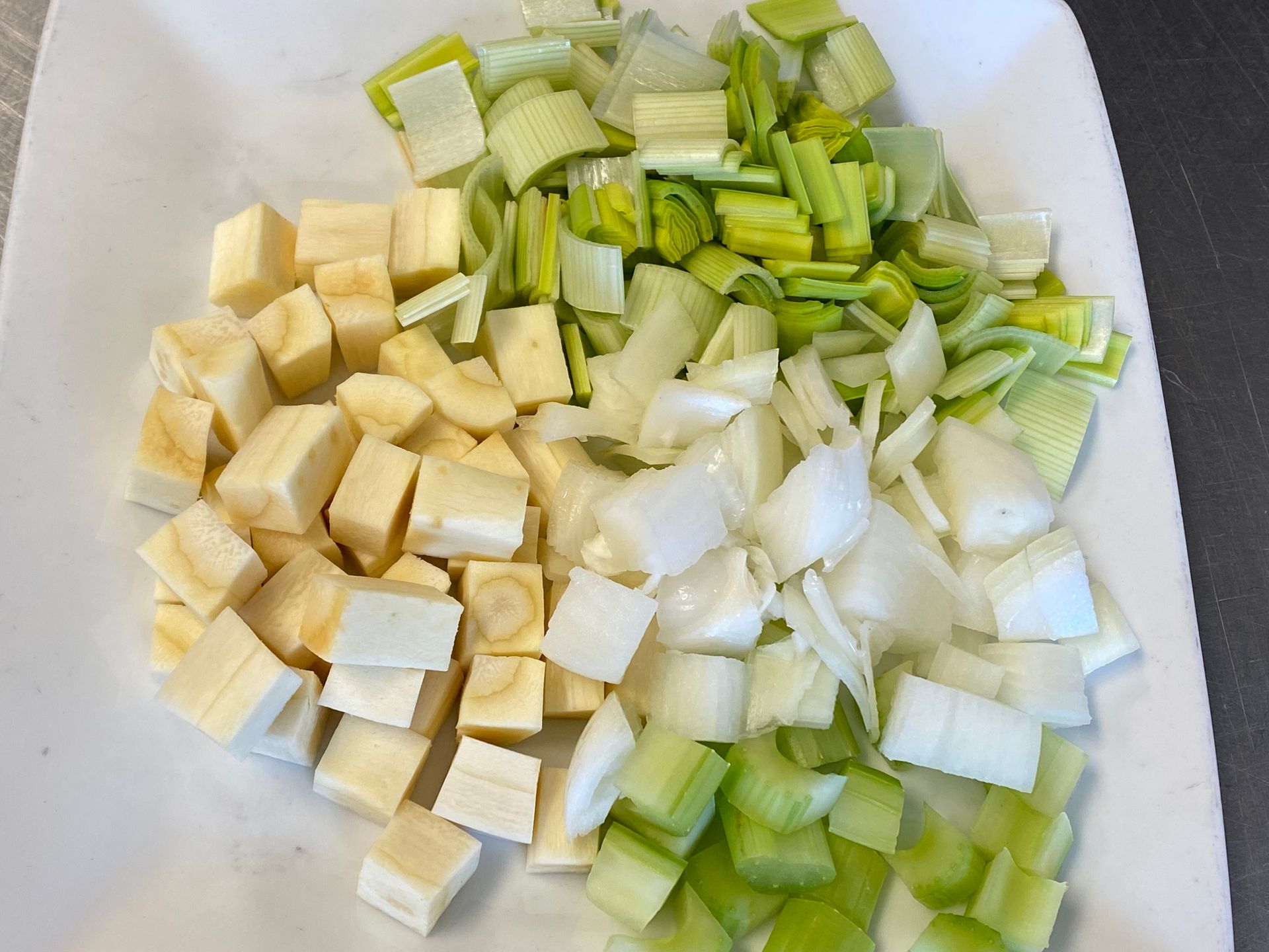White mirepoix (50% onion/ leek whites 25% parnsip/ 25% celery)