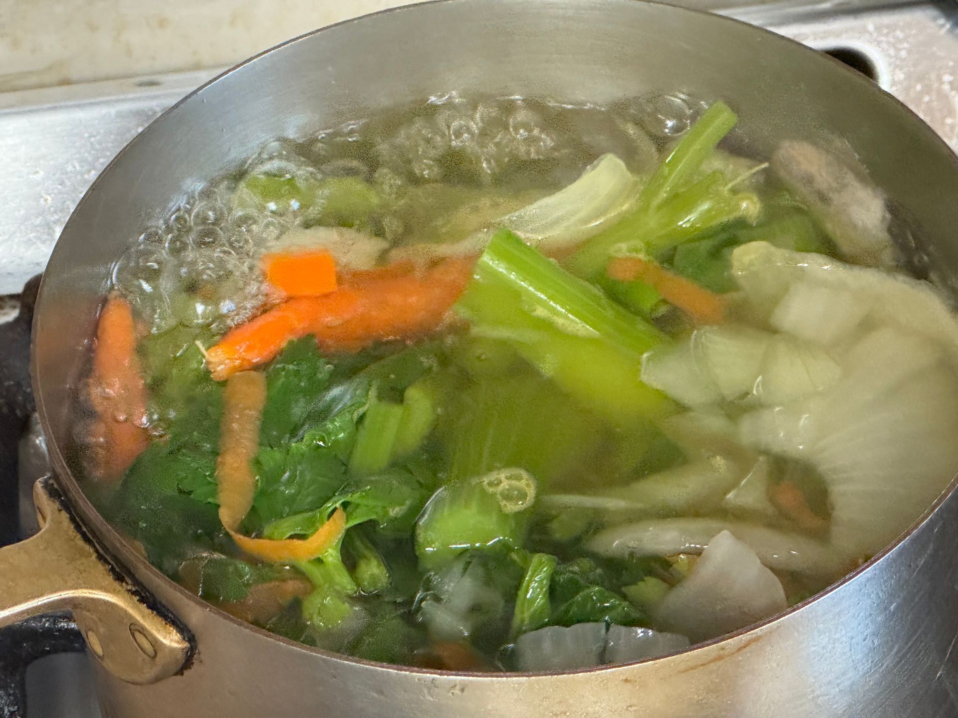 When the vegetables begin to sink, it's a good indicator that the stock is done-the vegetables will begin to become bitter if you continue to cook for too much longer.