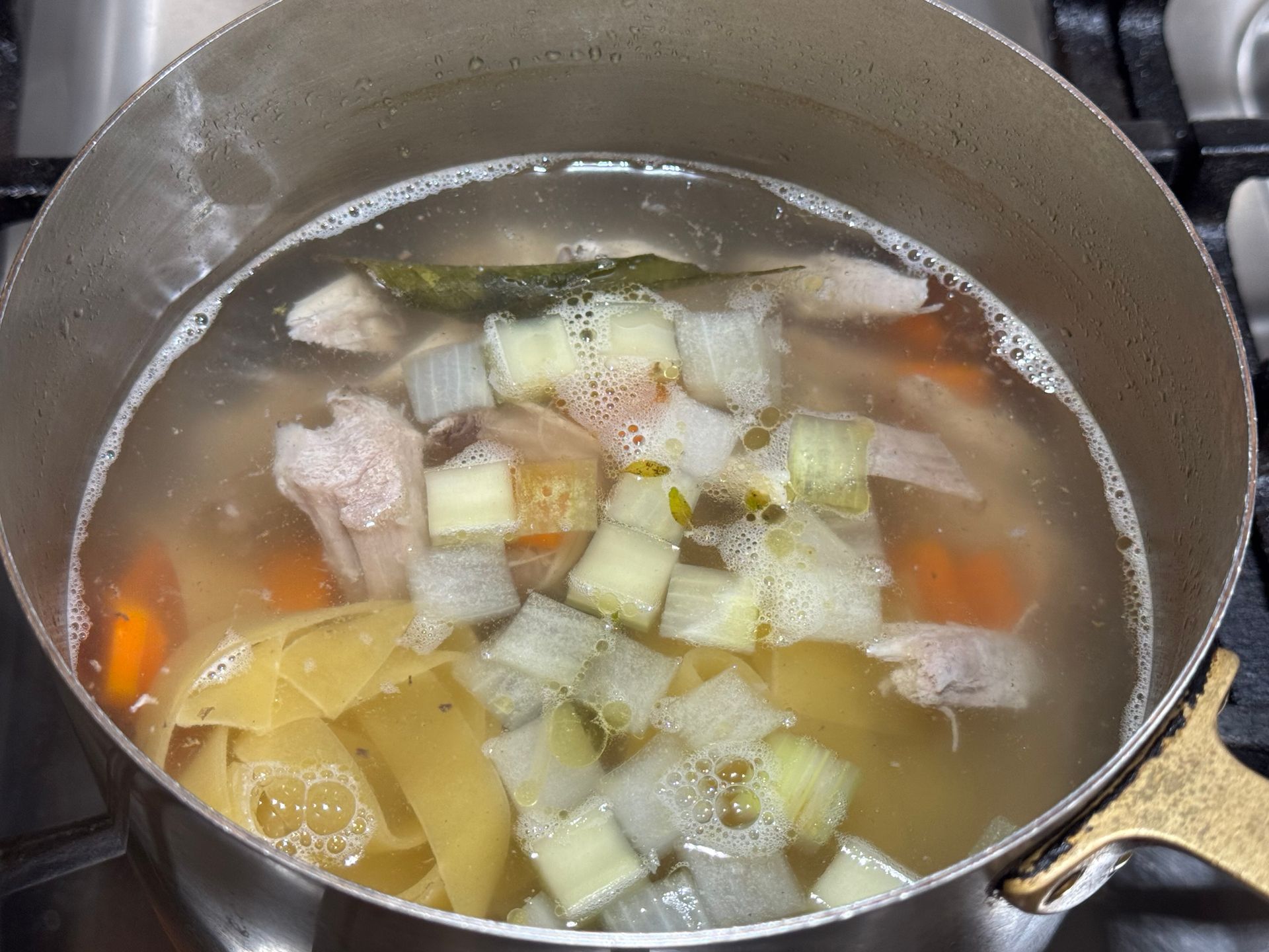 Add the noodles and simmer for 20 minutes until the noodles are tender. The starch in the noodles will slightly thicken the soup.