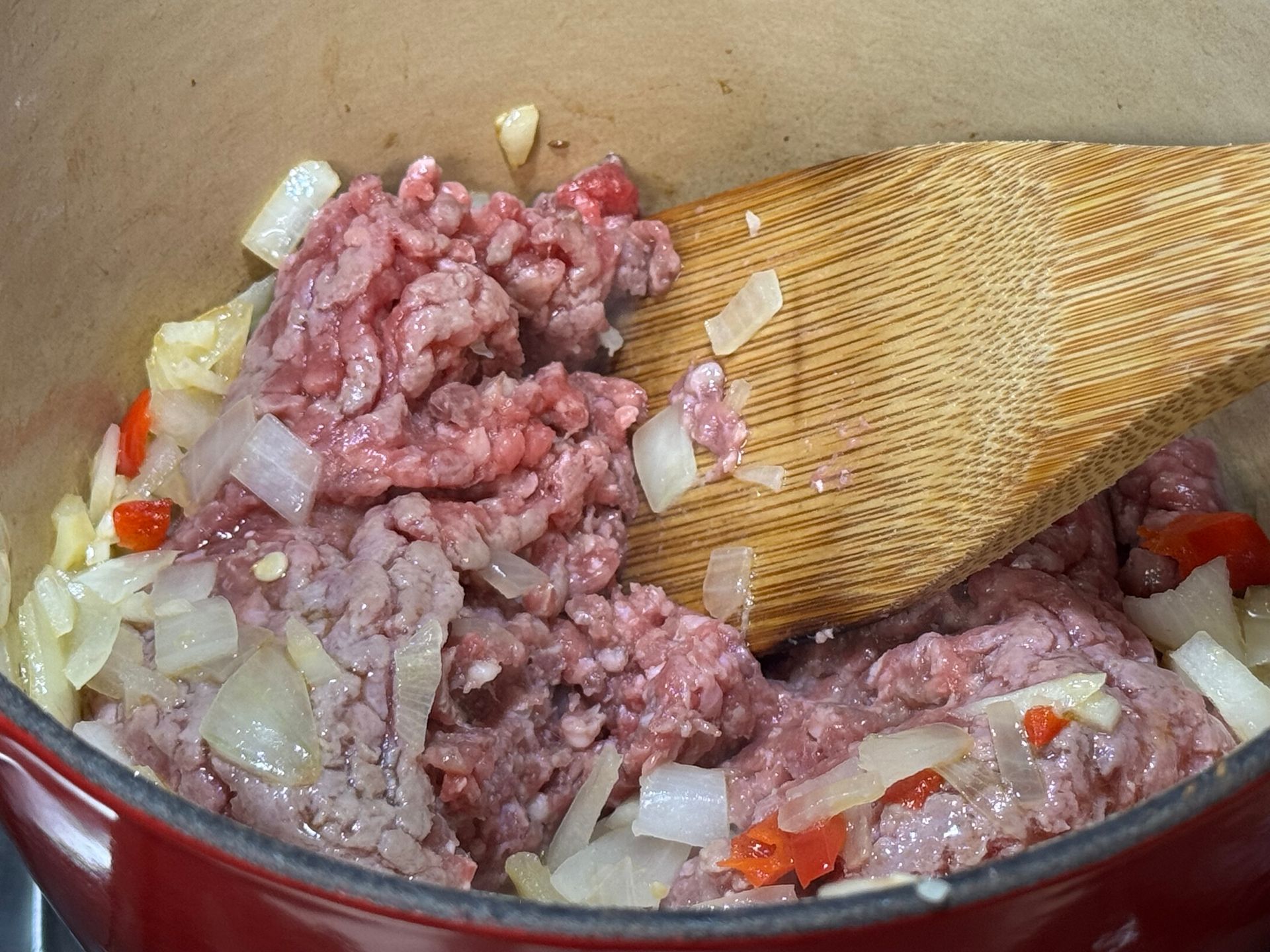 Add the ground meat and mix into the tomato/ onion mixture with a wooden spoon. Cook for 10 minutes at low heat, stirring and breaking up the meat as it cooks/clumps into small 'meatball' shapes.