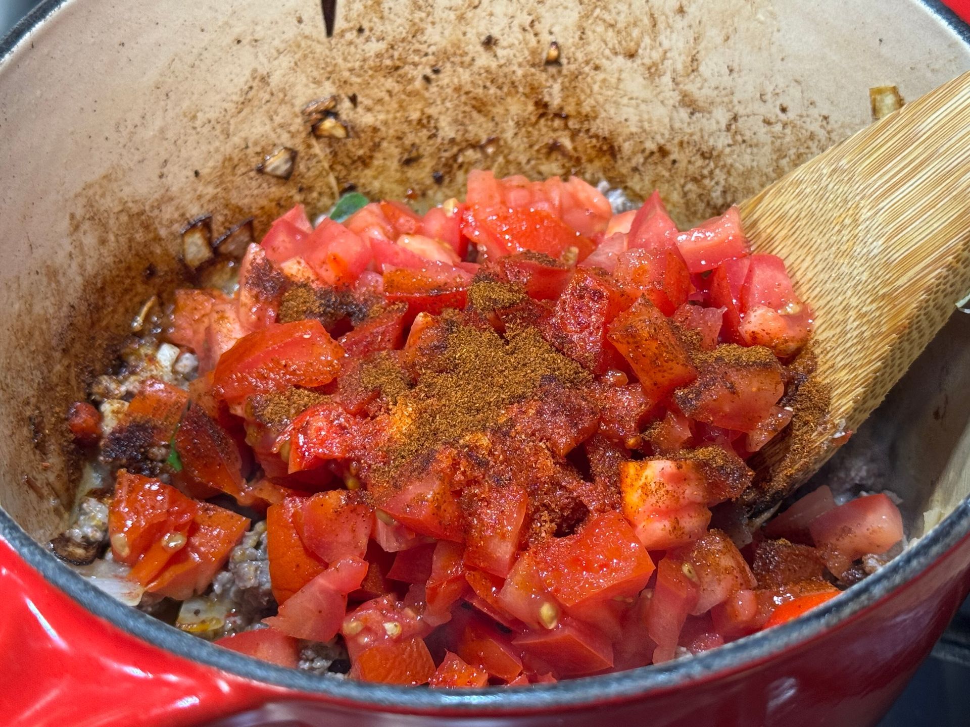 Slowly add the veal sauce, diced tomatoes and toasted spices to the chili, stirring into a smooth, homogeneous mixture.