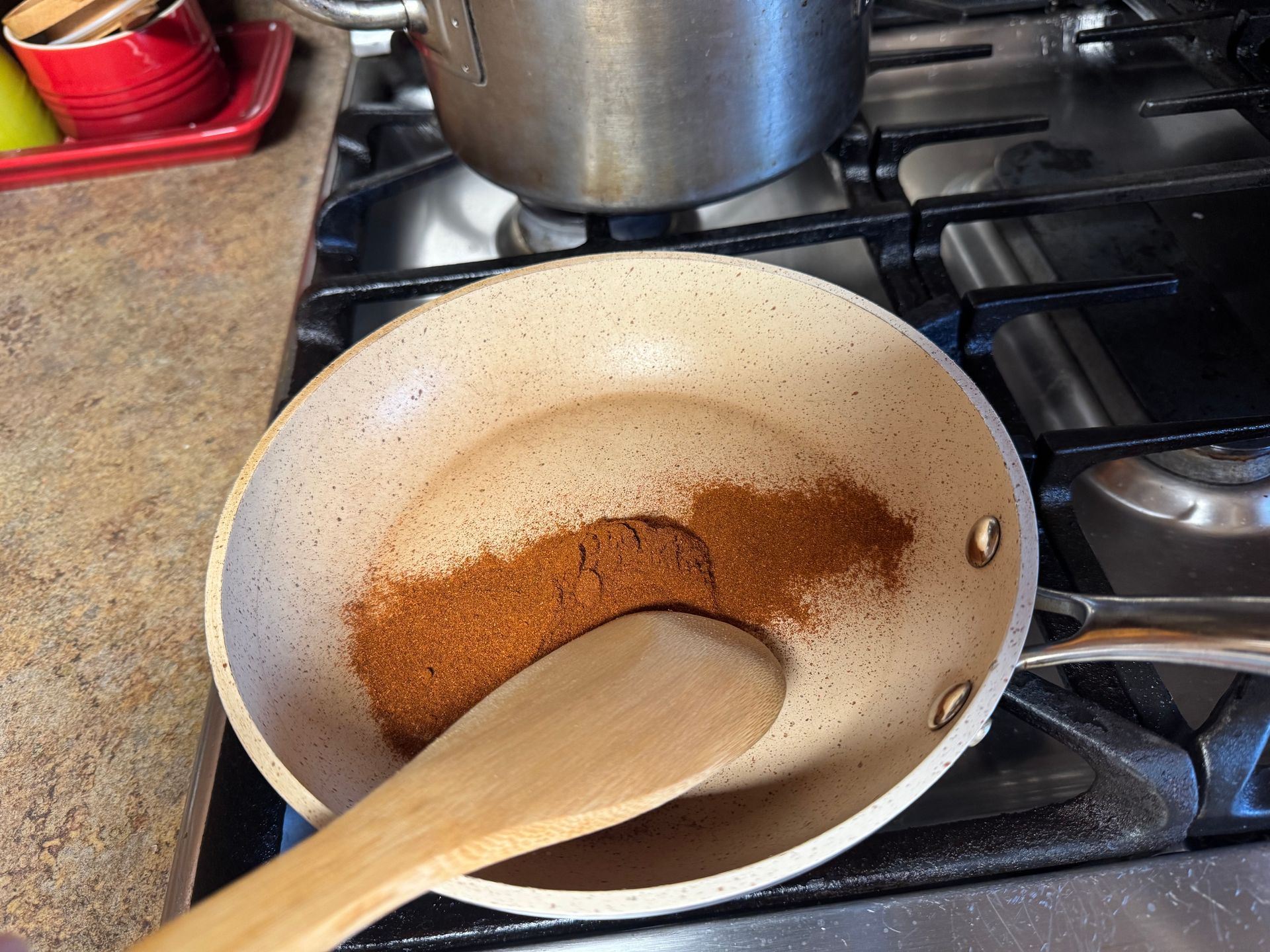 Assemble the ingredients; place all of the spices into a small, teflon pan and toast at medium heat, stirring with a wooden spoon. This will improve the flavor greatly. (especially if some of the spices have been in the cupboard for a long while)