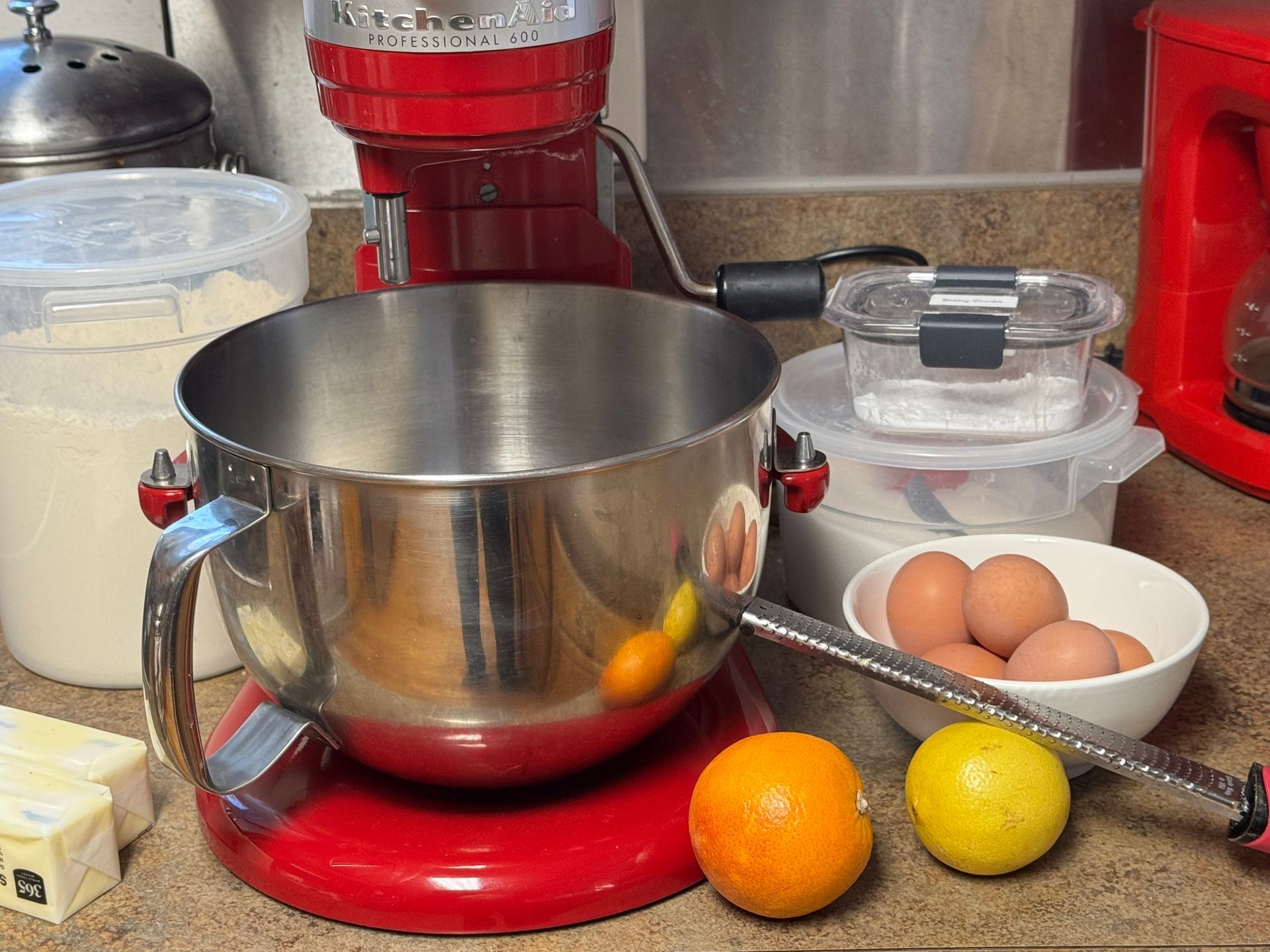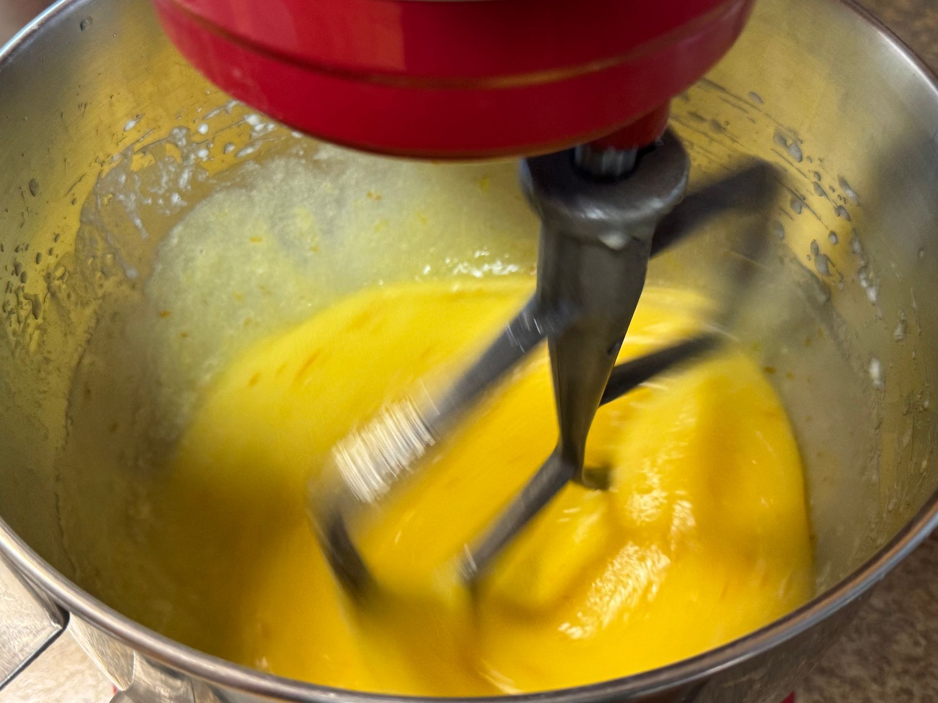 Add the melted butter and zest of lemon and orange; mix for 2 minutes to incorporate.