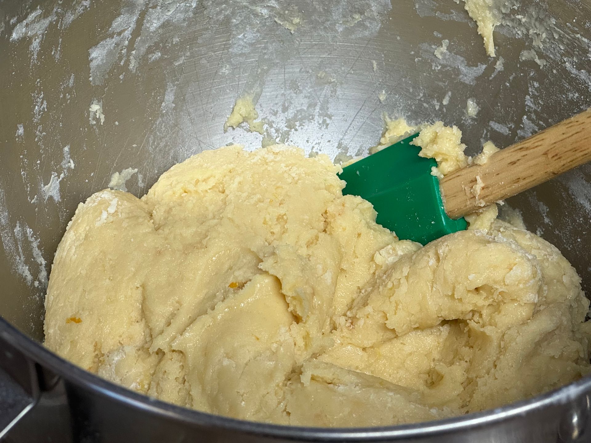 Add to the sugar, eggs and butter a little at a time; blend at low speed to create a soft cookie dough-be careful not to overwork. (about 2 minutes at low speed). Scrape several times during this process with the mixer turned off.