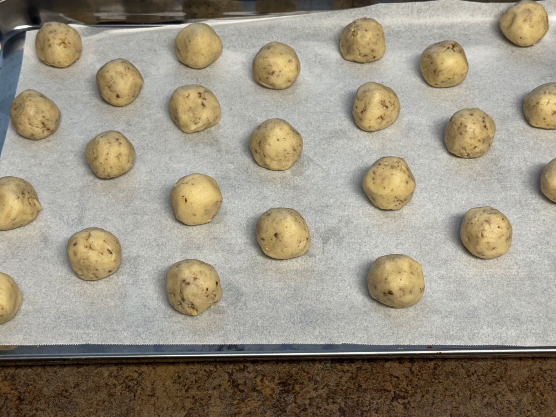 Place the bowl of dough onto the counter and carefully spoon/scoop small balls of the dough onto a sheet pan, lined with parchment.