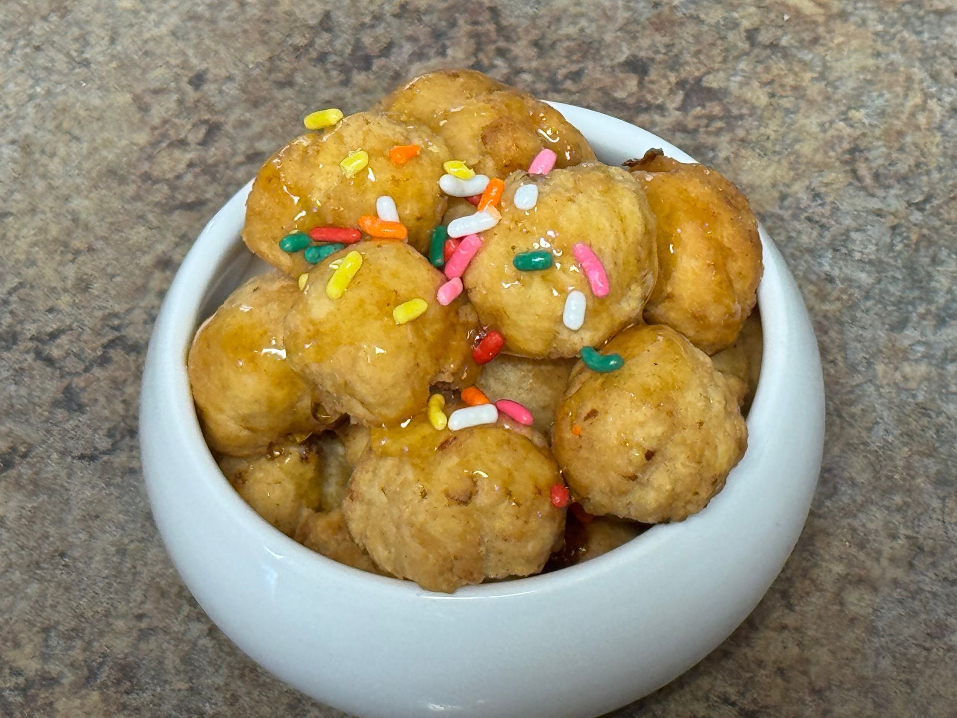 In Calabria, where my mother’s family is from, struffoli are also known as scalilli. Traditionally, struffoli should be crunchy on the outside, yet very light and airy within—generously coated in honey and finished with colorful sprinkles.