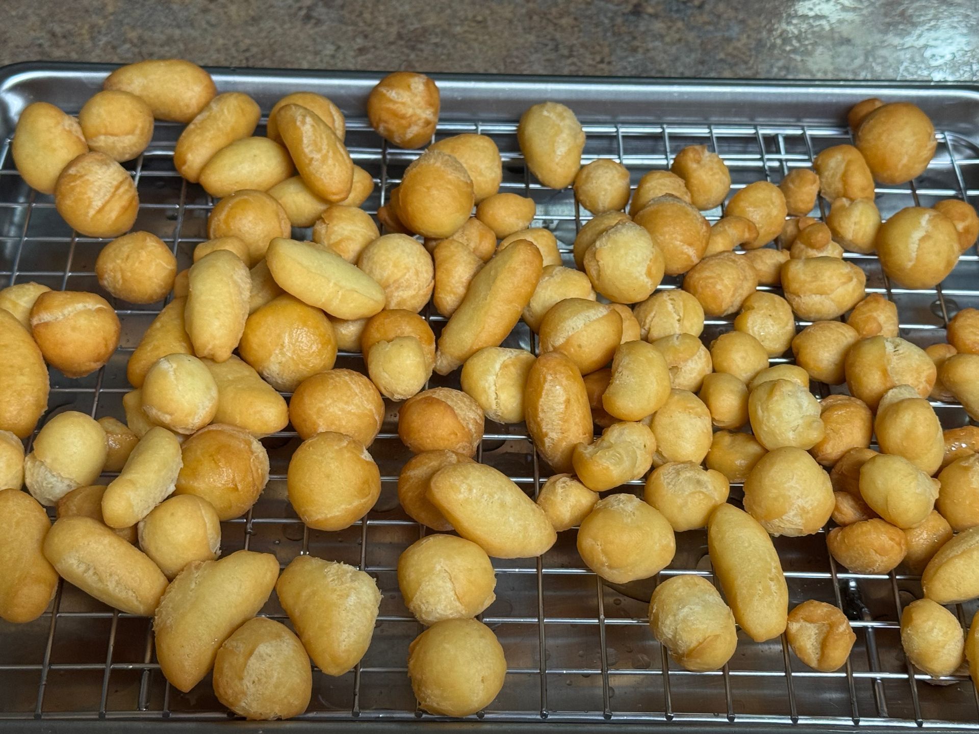 Strain with a slotted spoon onto a sheet pan with paper toweling, when the oil gets hot again, repeat until all of the struffoli are fried.