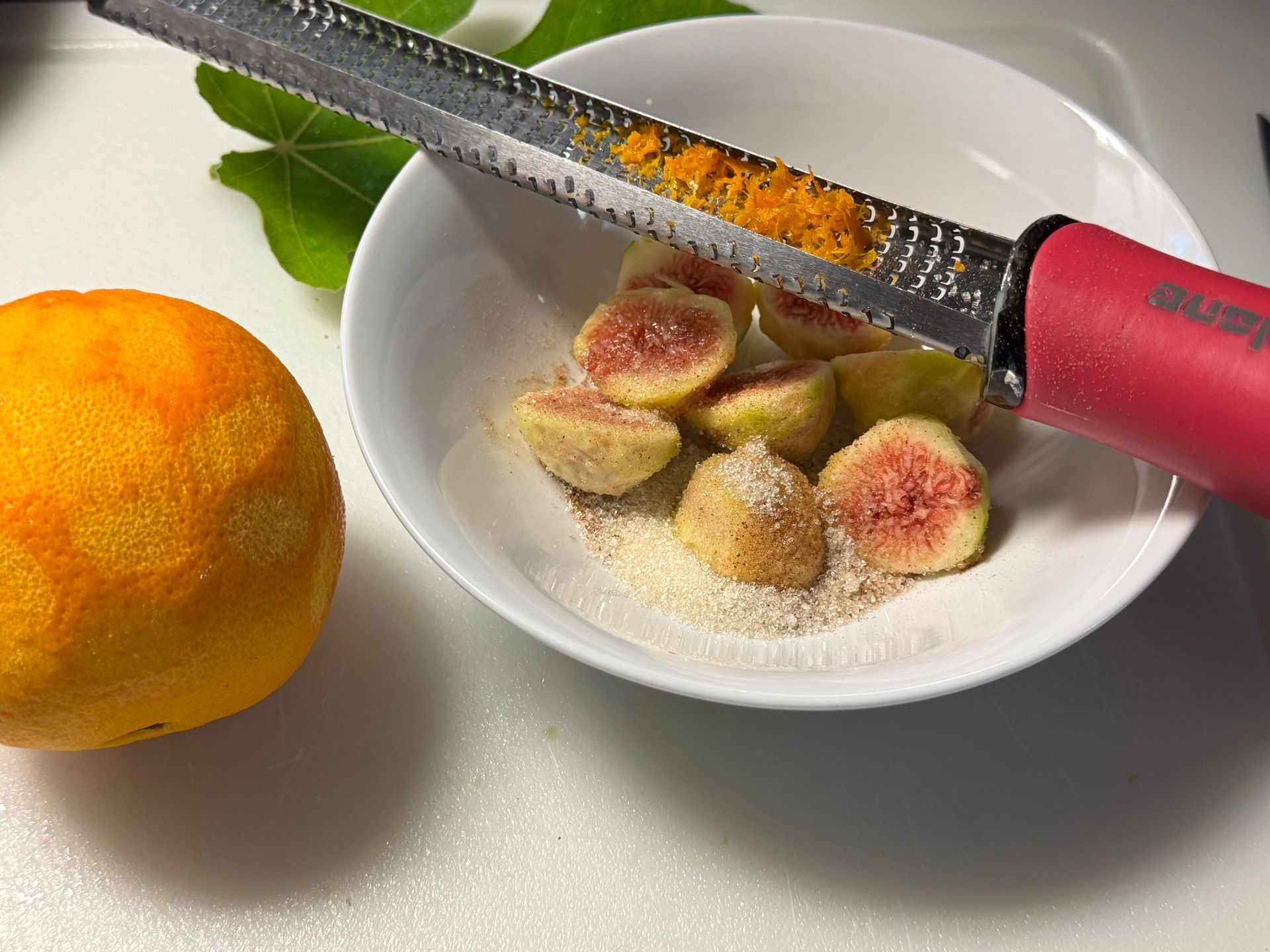 To prepare the filling, place the fruit into a bowl. Add the sugar, orange zest and spices; stir gently to blend.