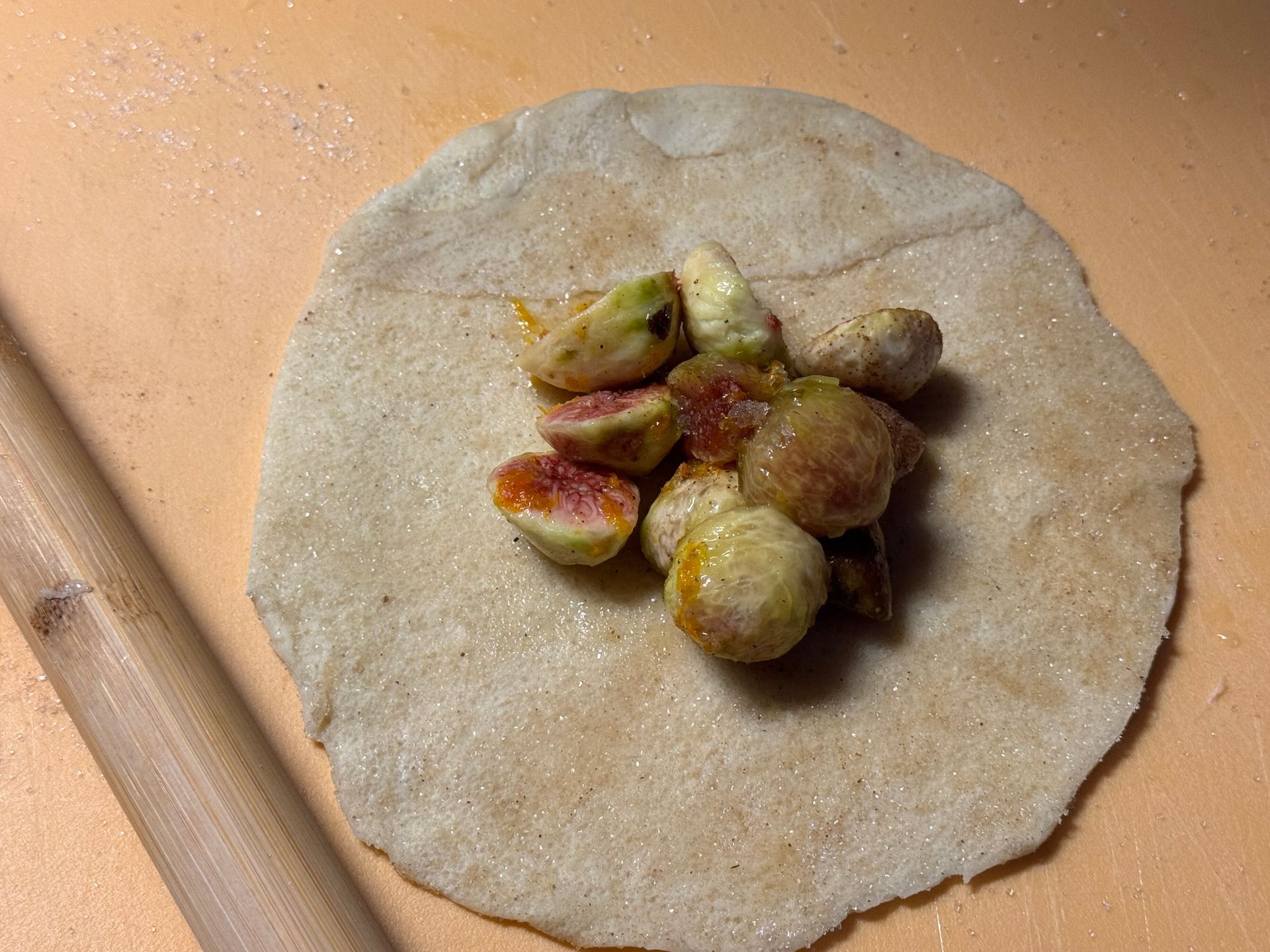 Place the dough onto a buttered sheet pan, spoon the fruit filling into the center of the dough and fold/ crimp the dough around the filling.