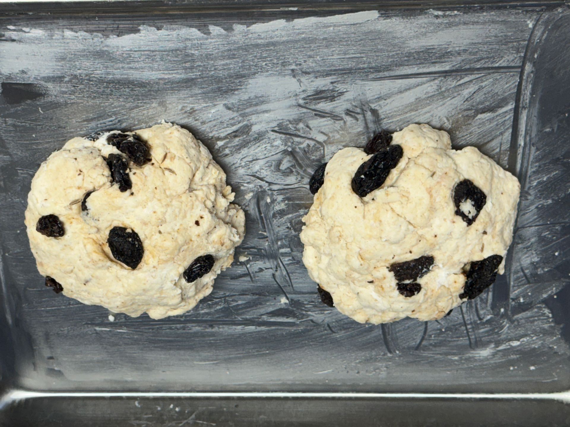 Cut the dough into 4 separate pieces and gently form into balls. Place each ball onto the buttered sheet tray-about 2 inches apart. The soda bread doesn't spread too much.