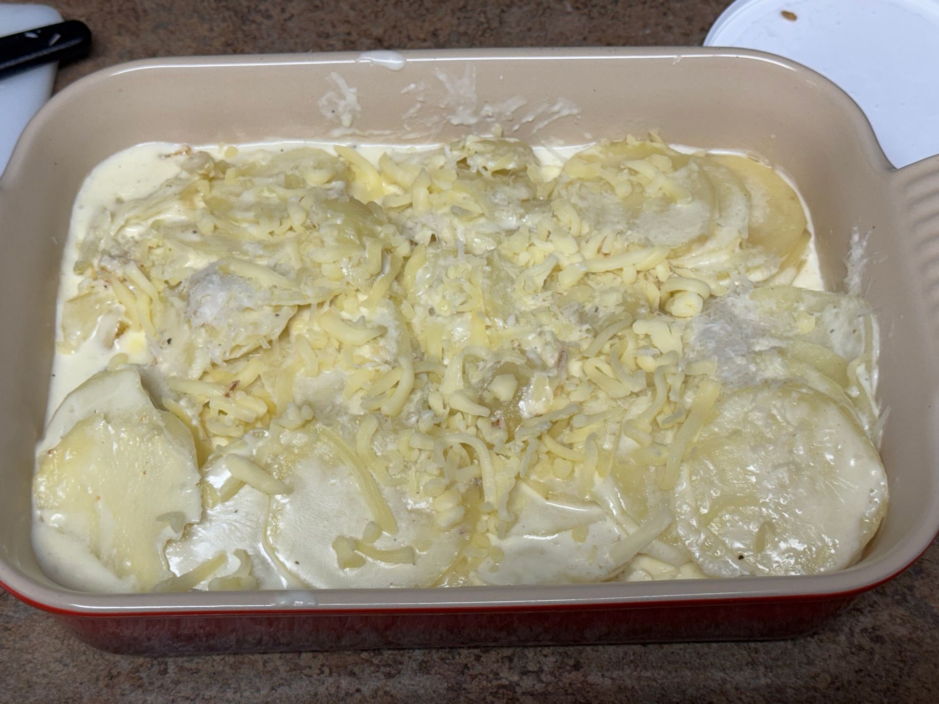 5. Add the cheeses (optional) to the potato mixture and fold together so that the cheeses are blended into the potatoes. Taste and add salt or pepper if needed. Pour out the potatoes into the casserole dish and spread the potatoes down evenly. There may be a little too much cream but it will be absorbed into the potatoes during cooking.