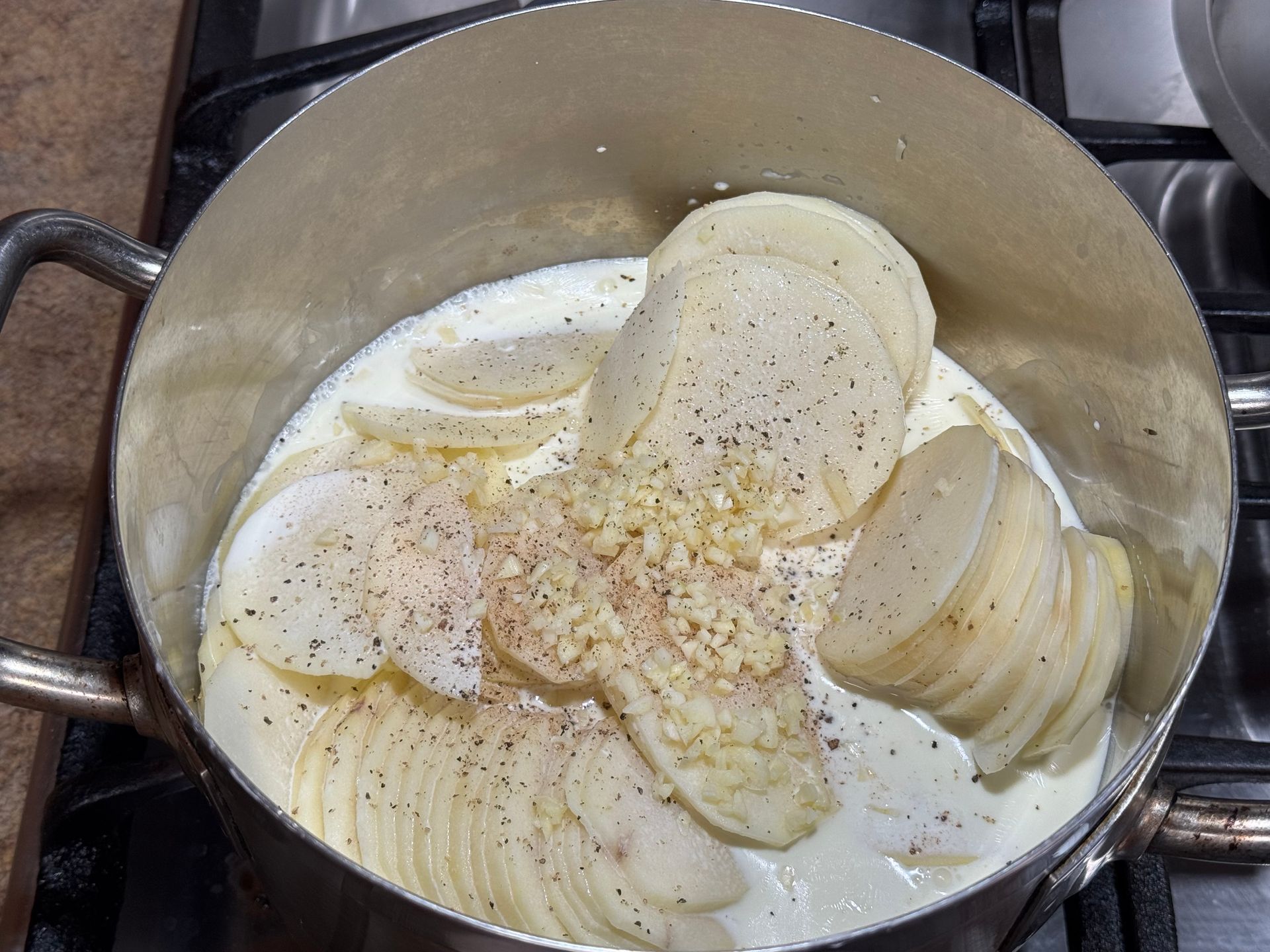 Do not rinse or put the sliced potatoes into water or you’ll wash off the starch. Put directly into the pot of cream and stir with a wooden spoon.