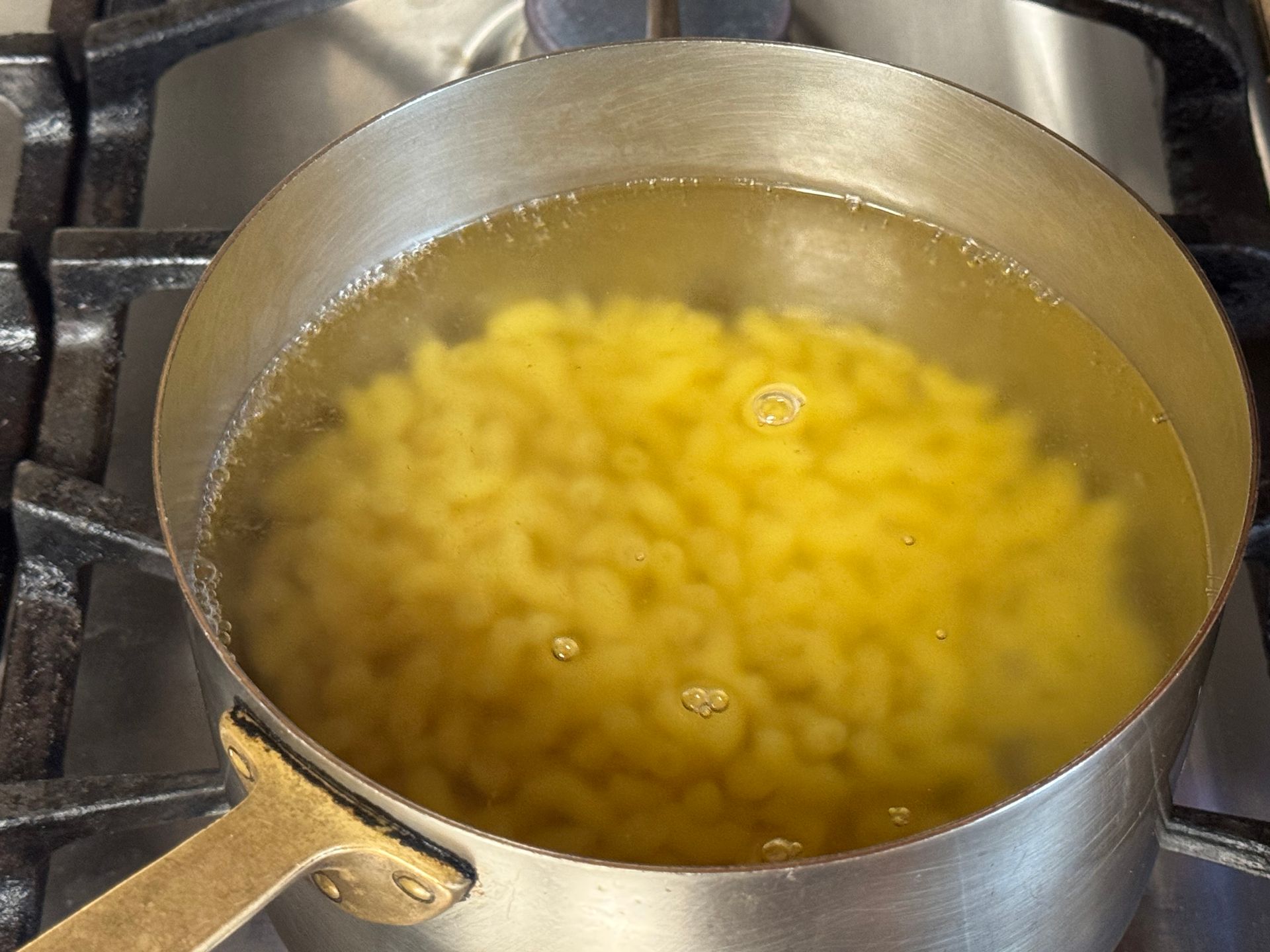 Simmer the macaroni until tender (about 8 minutes) and strain, reserving about 1 cup of the cooking water.