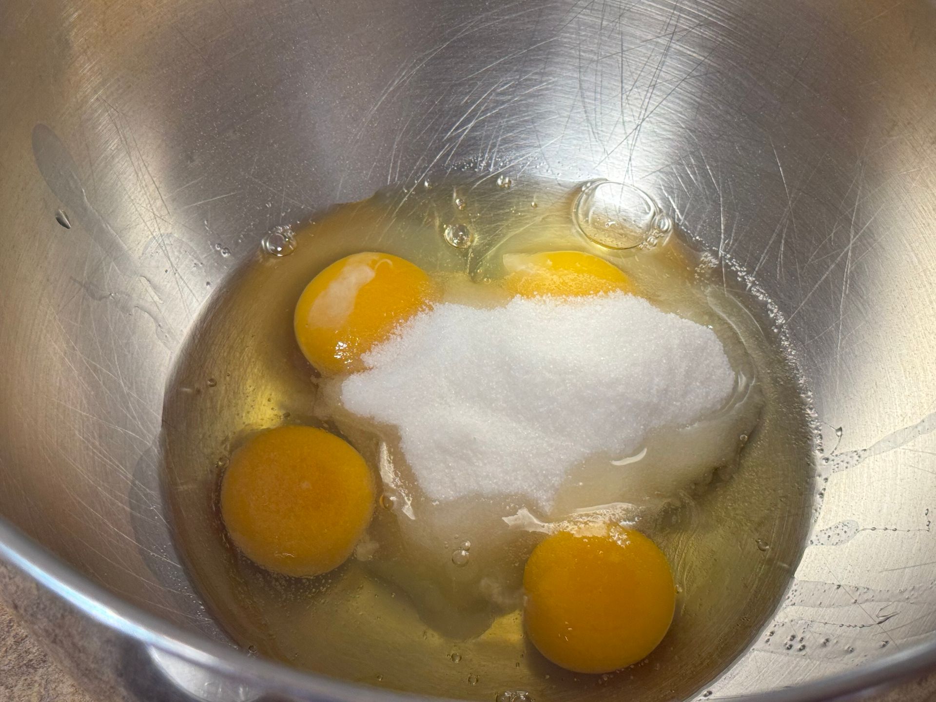 Place the remaining 1 cup sugar and the eggs into the bowl of a mixer (or a mixing bowl if you’re using a hand-held mixer) and whisk until doubled in volume and thick-about 3 minutes.