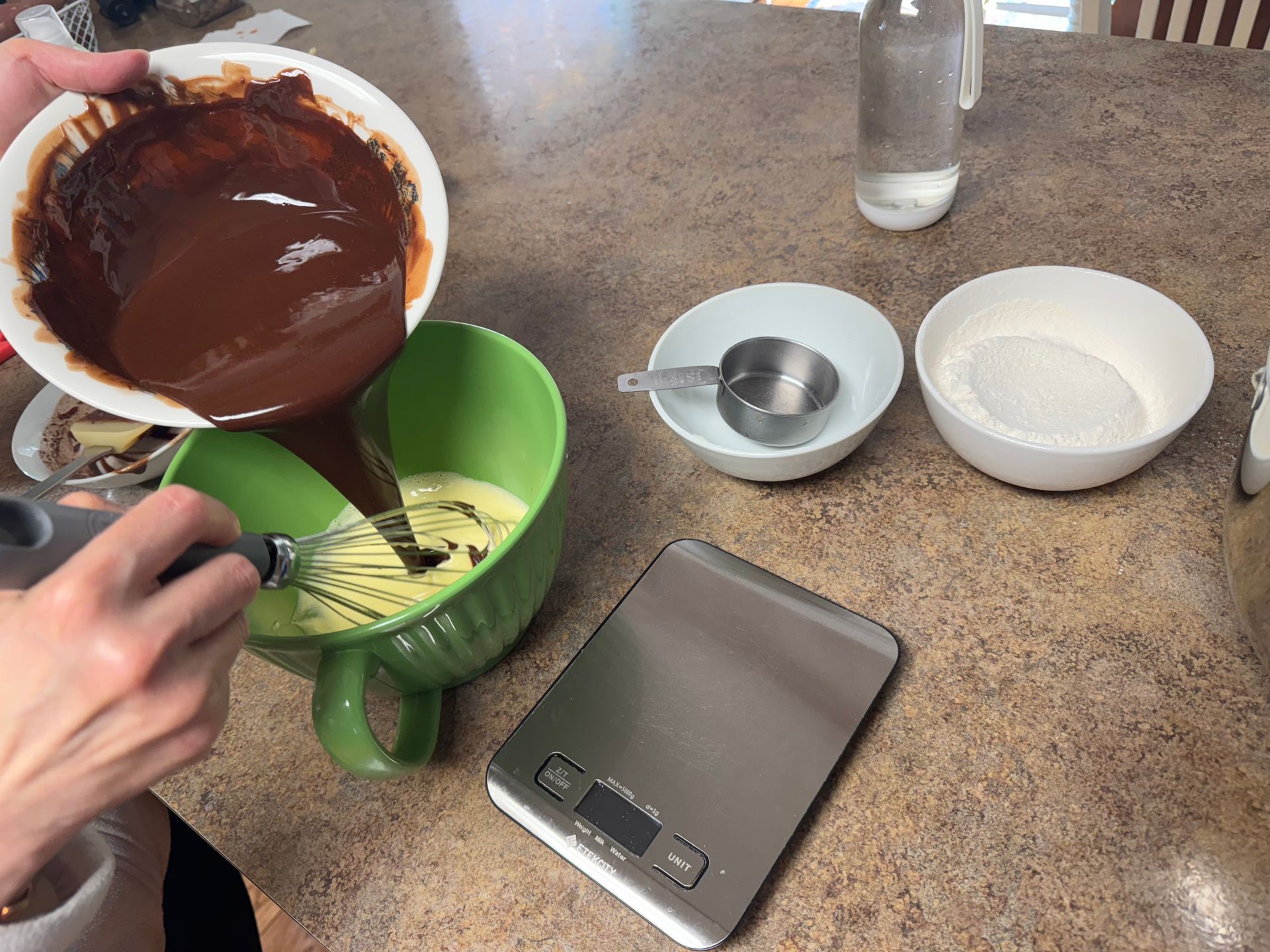 Slowly pour the chocolate in to the sugar and eggs, stirring gently but constantly with a rubber spatula so that the eggs don’t scramble from the heat.