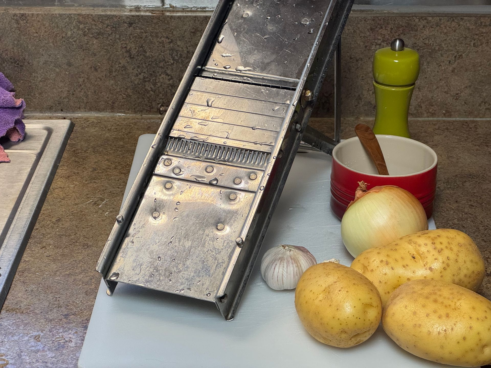“the baker’s potatoes”—is a classic French dish of thinly sliced potatoes layered with garlic and onions, then baked with a small amount of stock until tender and golden. As a young culinary student, I remember learning that the tradition came from village bakers, who would use the residual heat of their ovens after bread baking to cook the dish. It became a Sunday meal—practical, communal, and rooted in their culture- when no work was done for religious reasons.