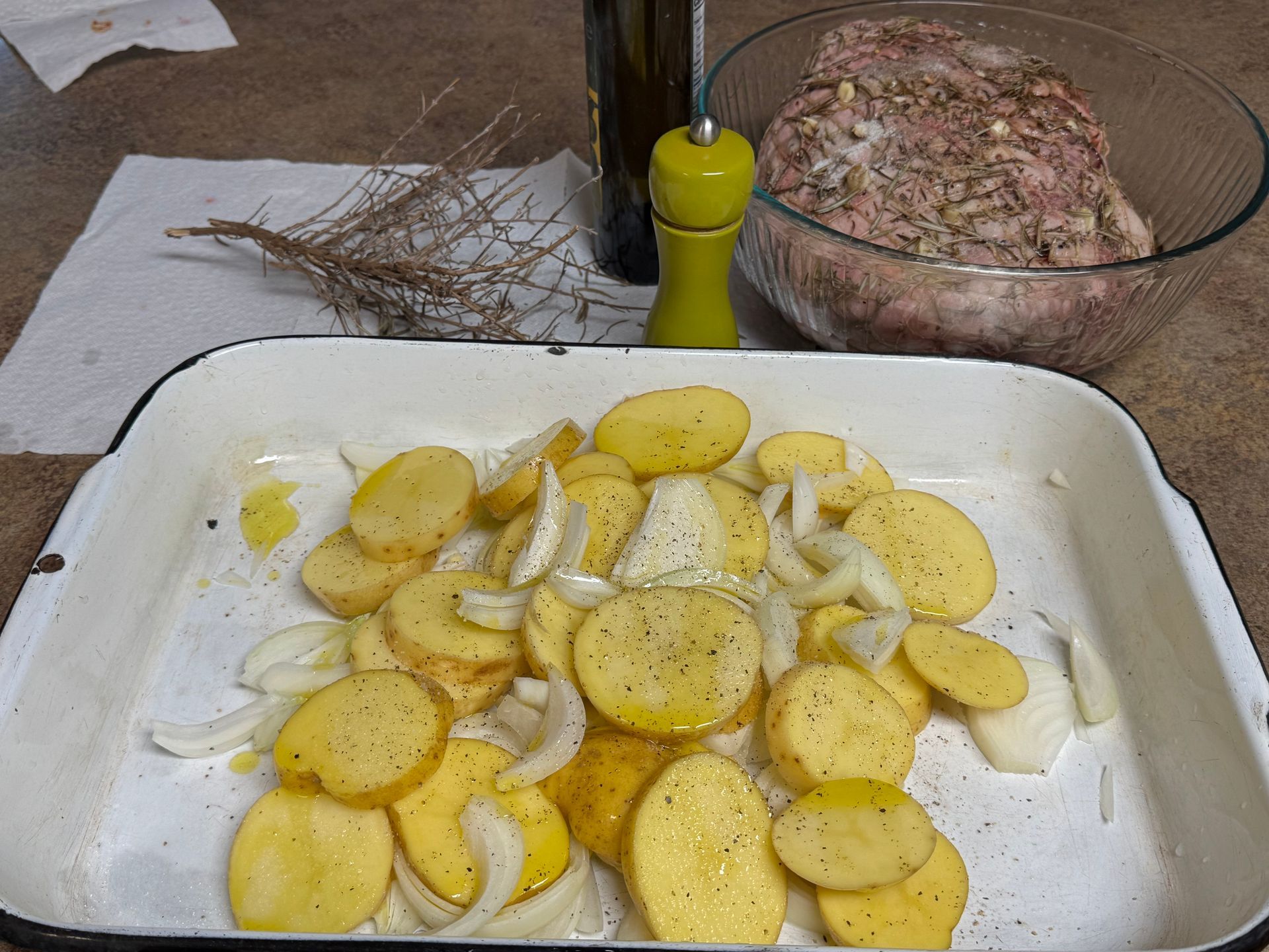 3. Thinly slice potatoes and onions (a mandoline is helpful). Toss the potatoes with the seasonings and herbs.