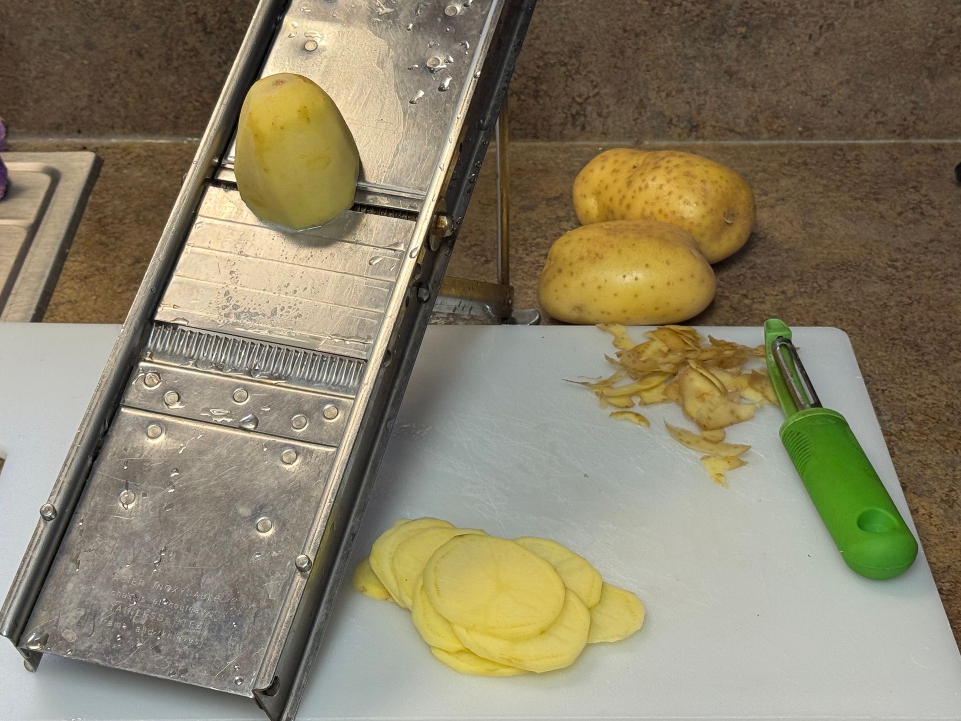Do not rinse or put the sliced potatoes into water or you’ll wash off the starch.