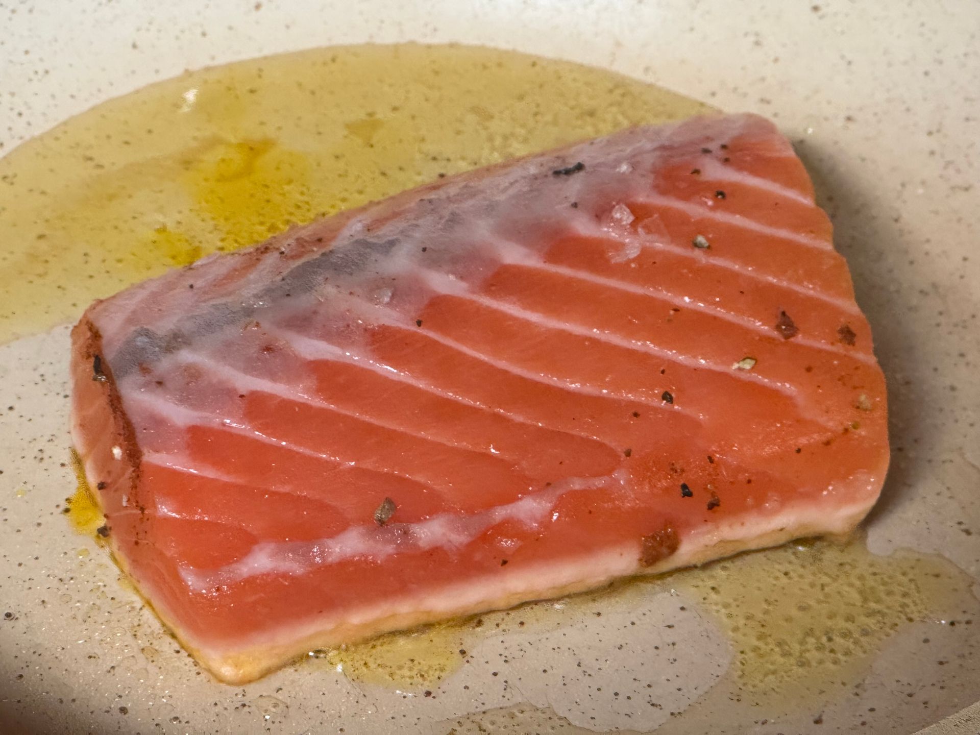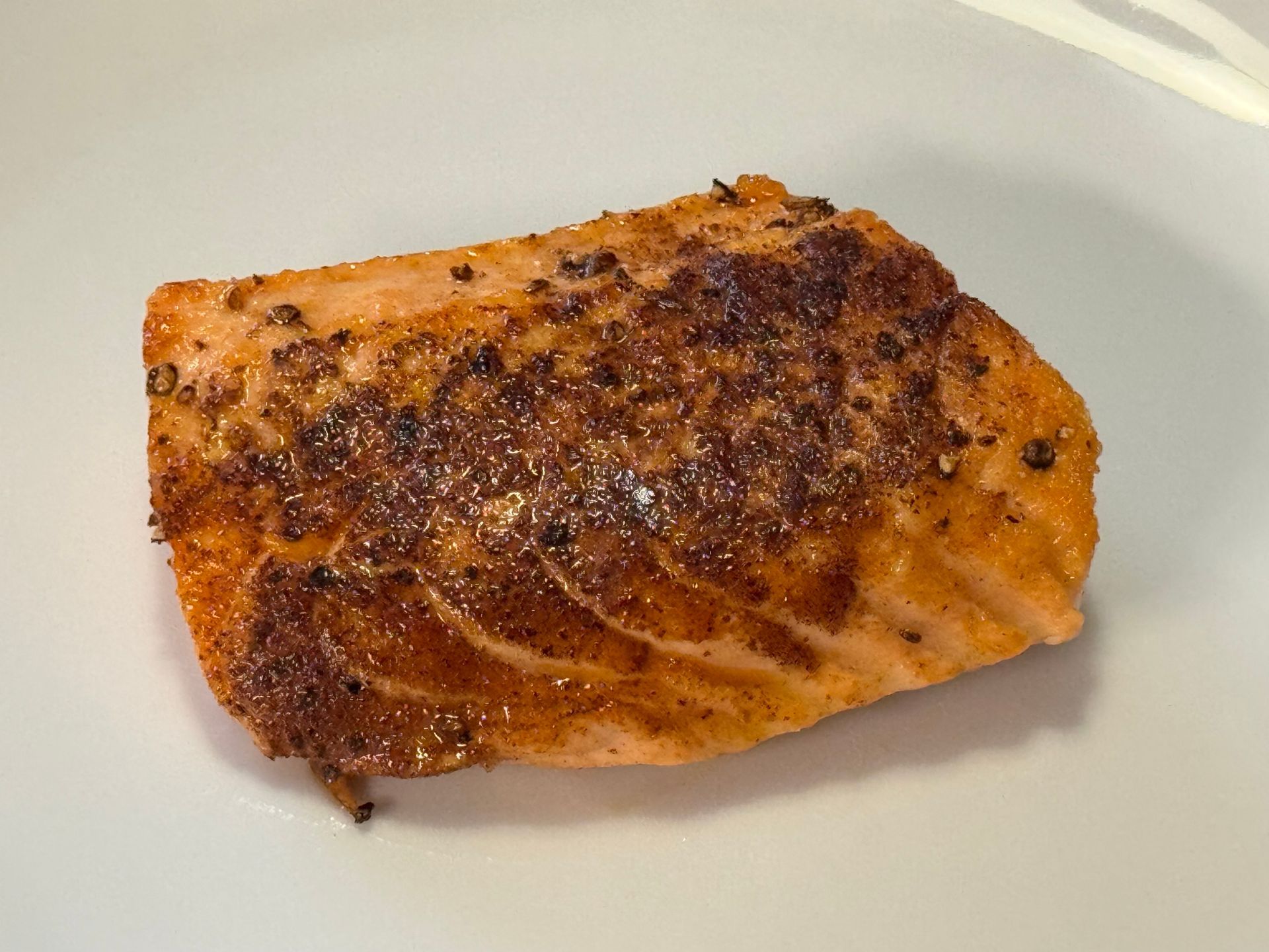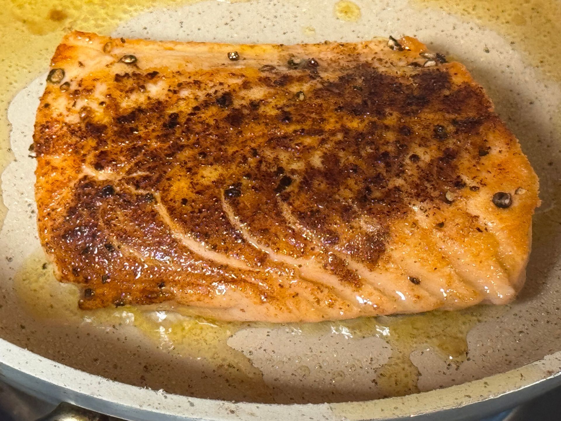 Salmon fillet is naturally the perfect thickness for grilling and sauteing. When it is nicely caramelized, it is also perfectly cooked.