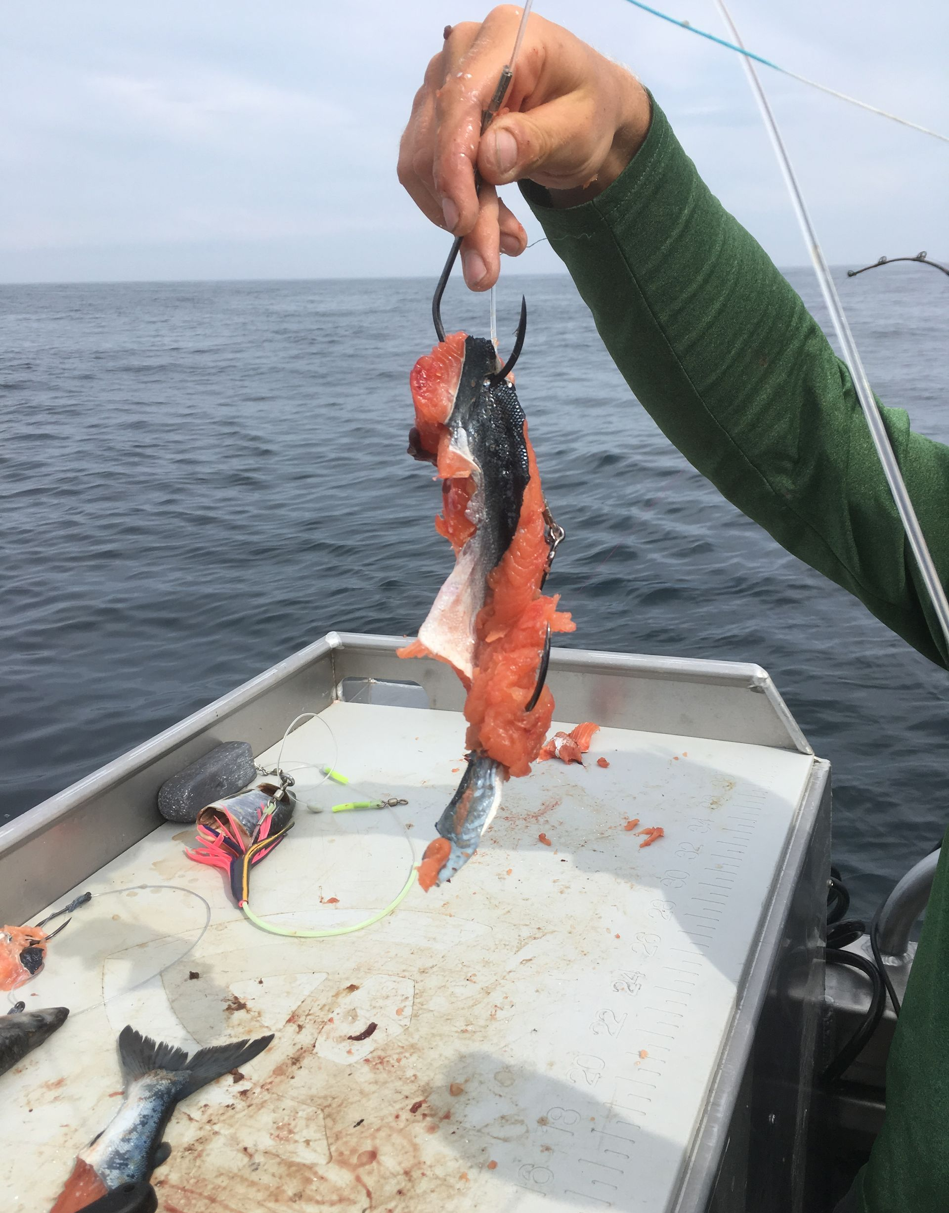I spent a week fishing for halibut in Alaska and we rigged up the belly of a chum salmon for bait... it worked really well!