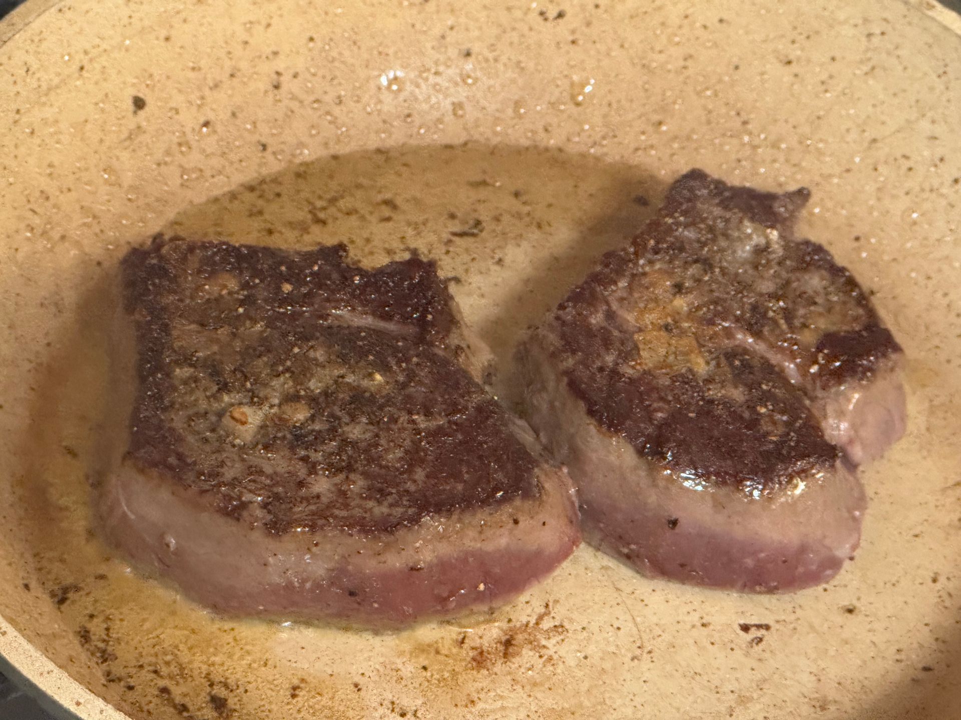 Place the medallions into the hot oil and let the beef get a nice brown crust-do not move the beef medallions or poke them. Cook until the sides begin to brown (about 3 minutes). Carefully invert and cook for 2 additional minutes.