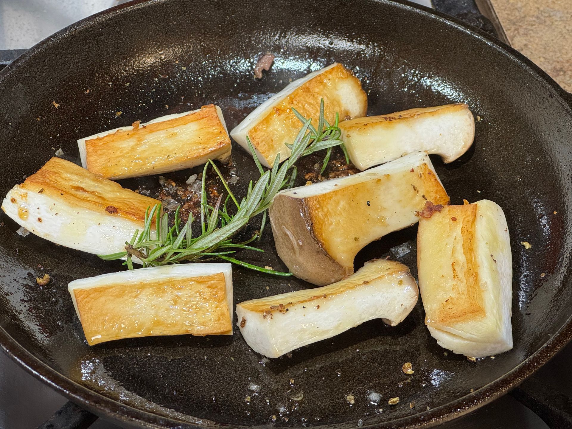 Mushrooms cooking with rosemary in the pan the beef was cooked in.