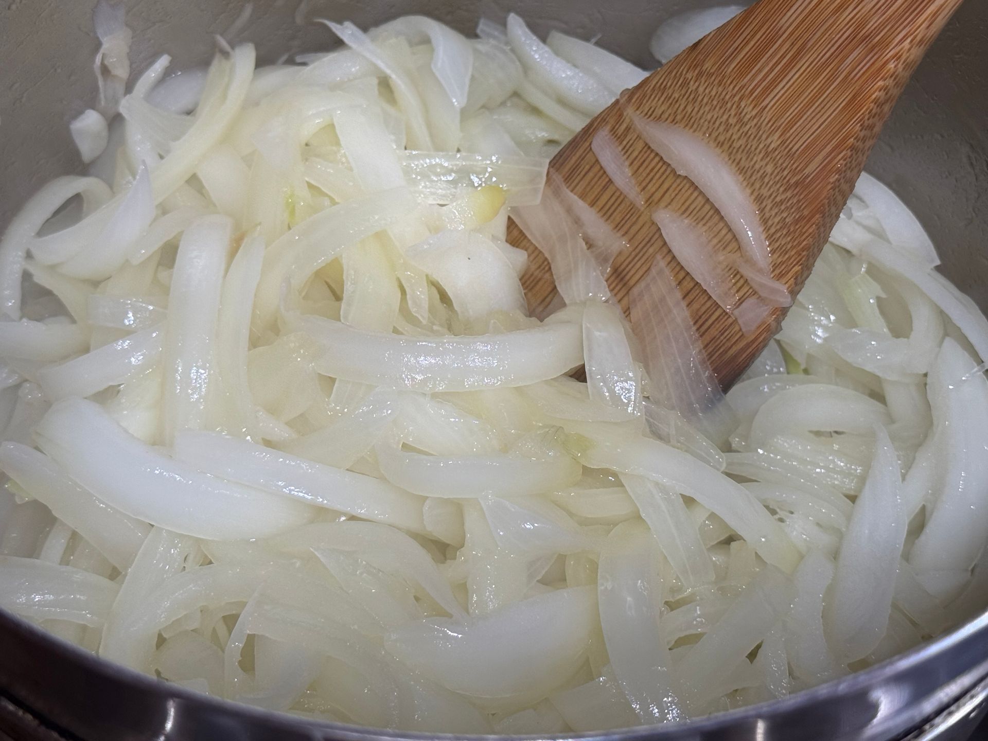 Sweat the onions in the bacon fat until tender. (about 4 minutes); add the red cabbage and continue cooking, stirring with a wooden spoon occasionally. (about 8 minutes)